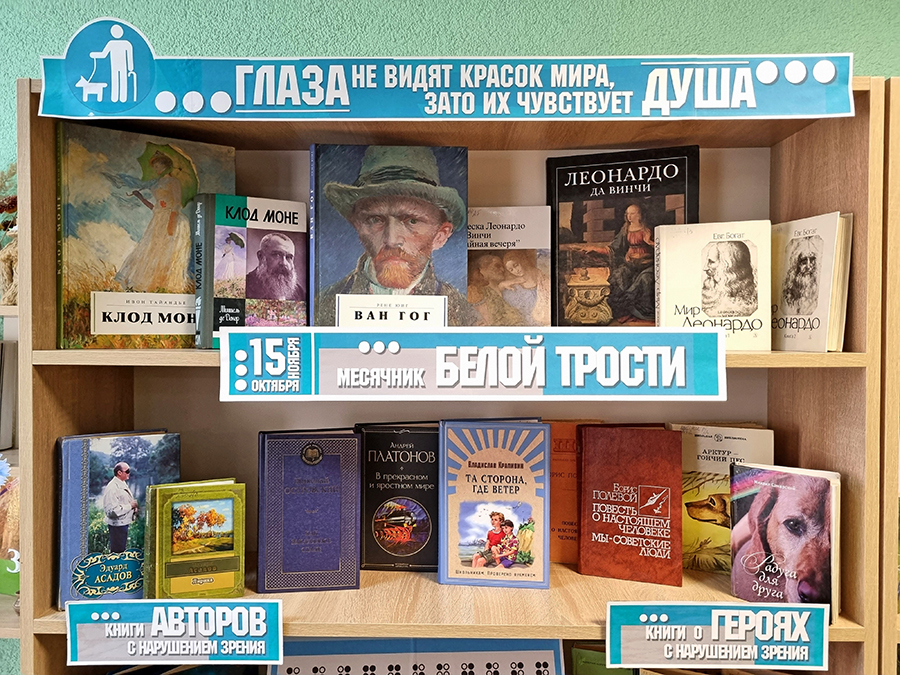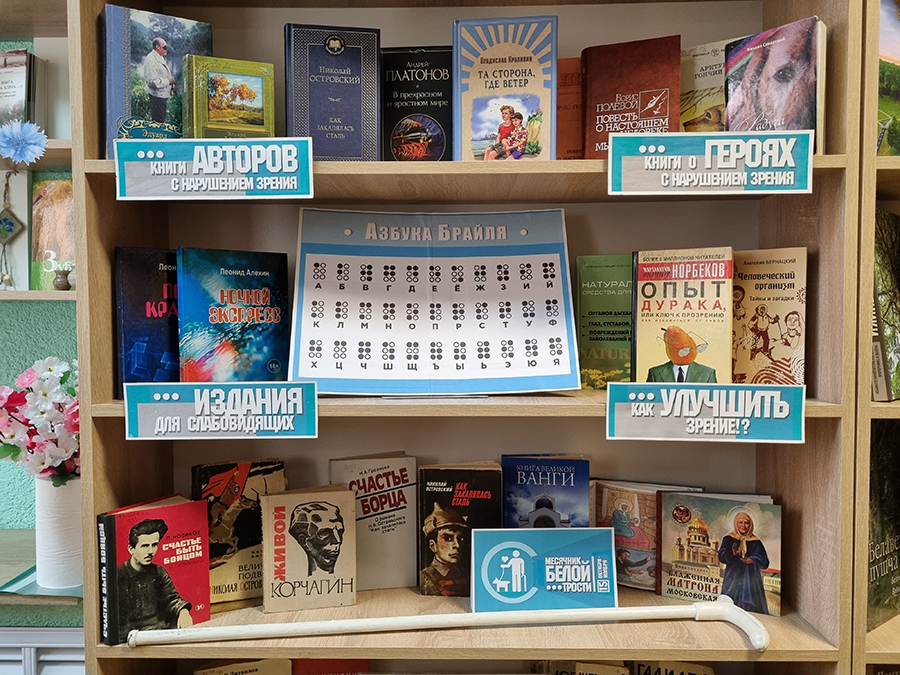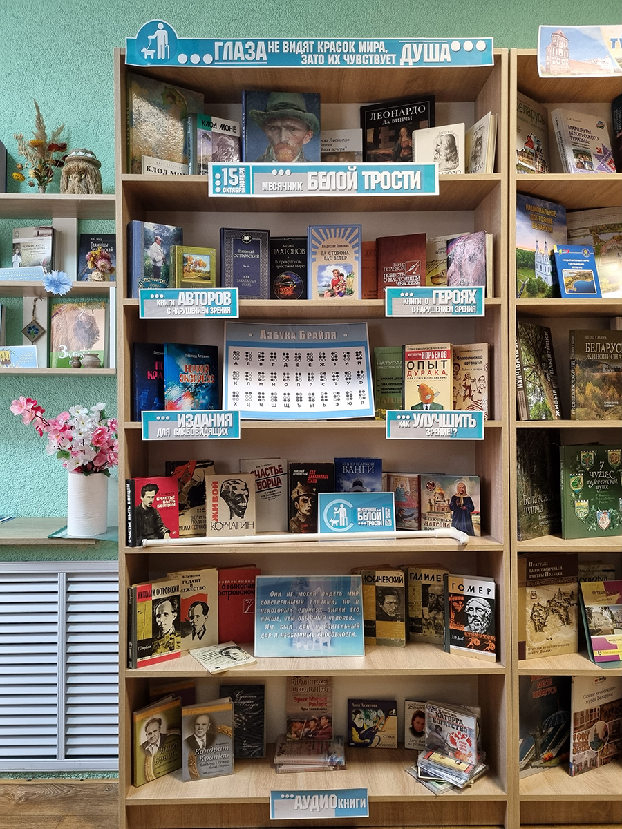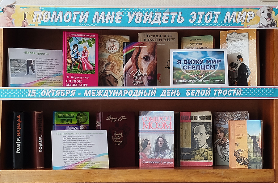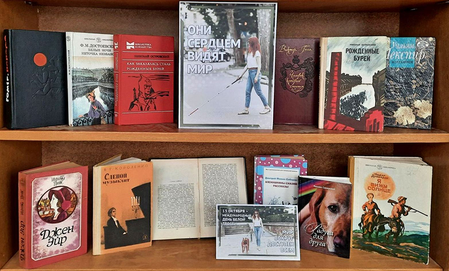 В преддверии месячника в библиотеках сети были оформлены тематические выставки: «Есть ценности, которым нет цены», «Наперекор судьбе», «Зорко одно лишь сердце», «Они сердцем видят мир», «Помоги мне увидеть этот мир!». На полках размещены книги, которые вдохновляют и учат наших читателей видеть мир глазами души. Там можно найти рассказы о людях с нарушениями зрения, о их силе, мужестве и внутренней красоте. Читателям представлена художественная литература и познавательные издания, раскрывающие, как важно ценить каждое мгновение и не судить по внешнему виду.