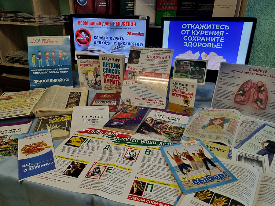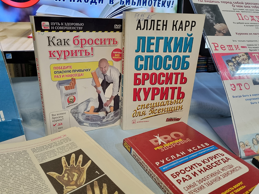 Также к этому дню в библиотеках оформлены тематические выставки: «Даже не пробуй», «Наш мир без вредных привычек», «Отказ от курения — лучшее решение», «Вейп — это опасно», «Без табака прекрасна жизнь! От сигареты откажись!». На экспозициях были представлены книги, журналы и брошюры, содержащие полезную информацию о вреде курения, способах отказа, мотивирующие истории и современные исследования о вреде вейпа и других никотиносодержащих продуктов. Эти выставки привлекли внимание читателей, стимулировали к размышлениям и помогали выбрать путь к здоровью.