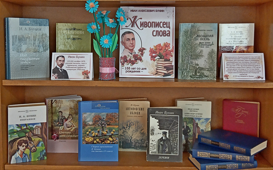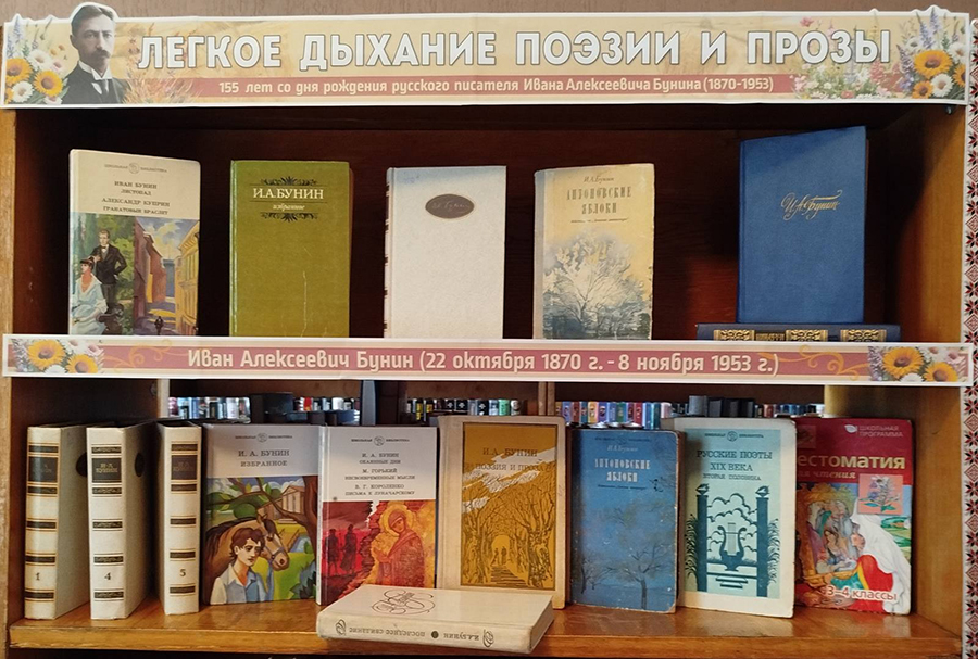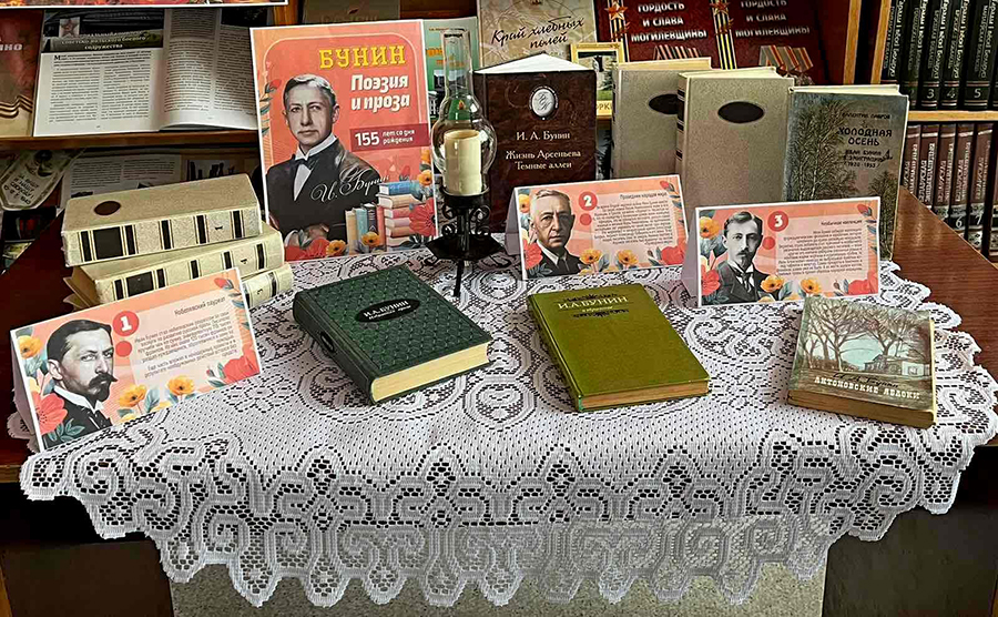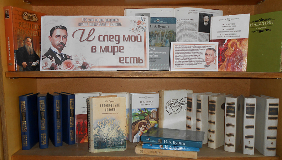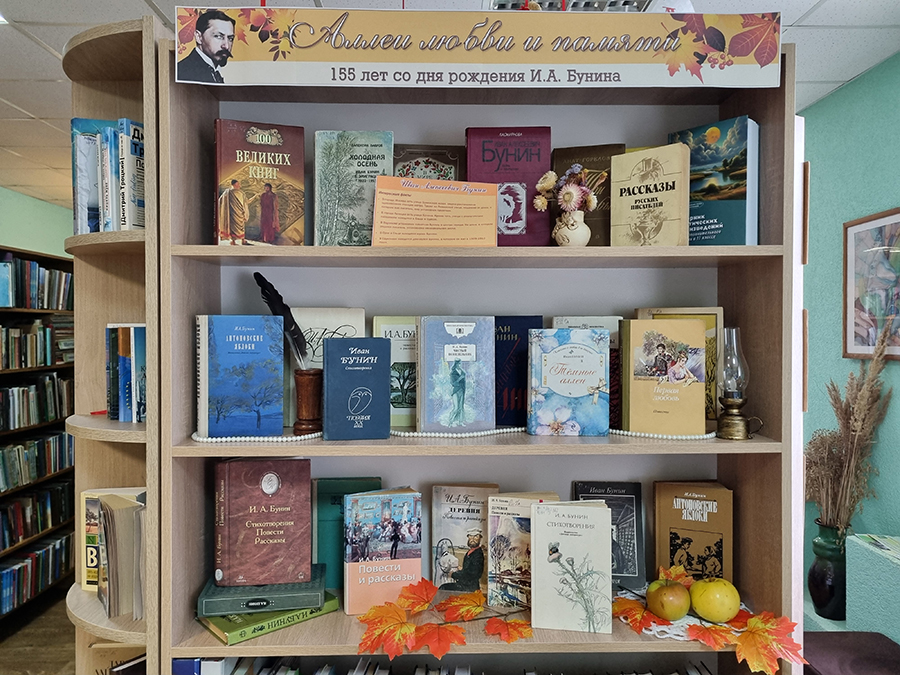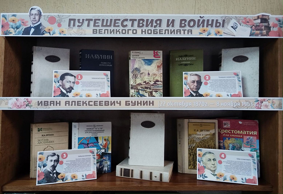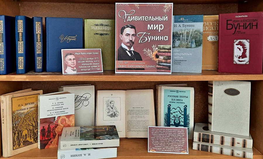 К юбилею писателя библиотеки сети подготовили уникальные выставки: «Аллеи любви и памяти», «Путешествие и воины великого нобелиата», «Легкое дыхание поэзии и прозы», «Удивительный мир Бунина», «Бунин. Поэзия и проза», «Живописец слова», «И след мой в мире есть», посвящённые жизни и творчеству великого писателя.