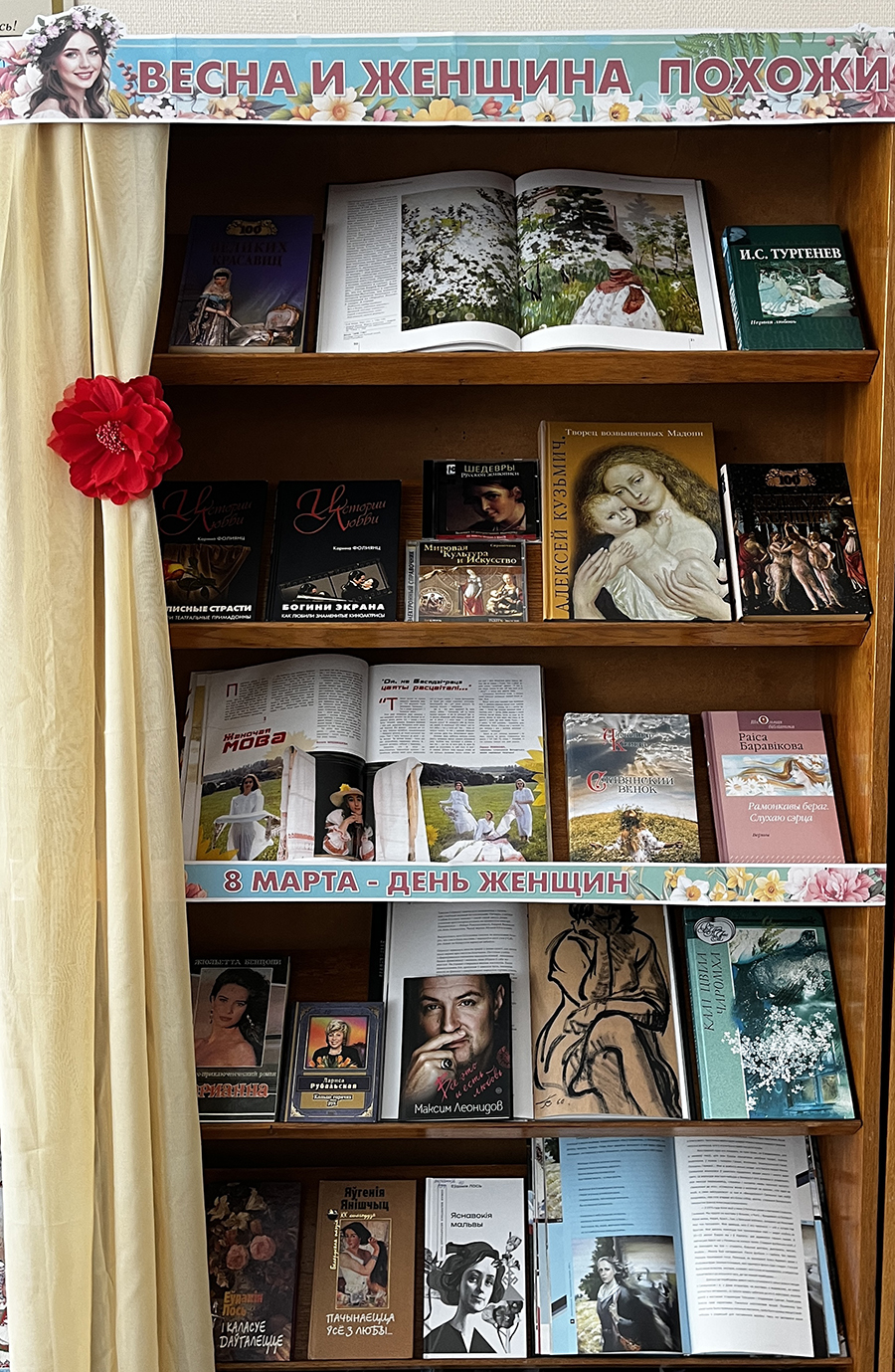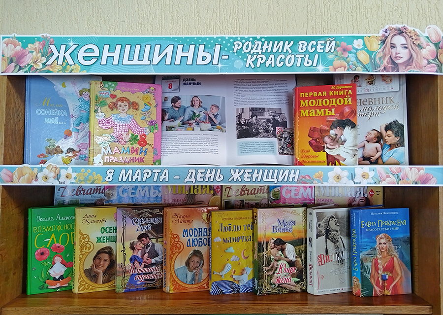К этому замечательному дню в библиотеках сети были подготовлены тематические книжные выставки: «Её Величество – Женщина», «Женщины – родник всей красоты», «И образ милый, незабываемый», «Самым милым и любимым!», «Весна и женщина похожи!», «О чём пишут женщины», «Женских рук прекрасное уменье», «Про весну, любовь и красоту», «Кто лучше женщины расскажет про любовь». На выставках представлены книги и журналы о знаменитых женщинах, произведения, принадлежащие перу авторов-женщин, стихи о любви, весне и красоте, издания, рассказывающие о талантах, мастерстве и вдохновении, которые дарят миру женщины, а также детская литература о мамах.