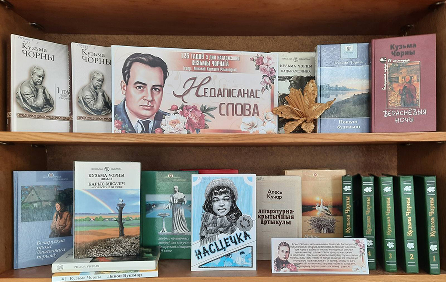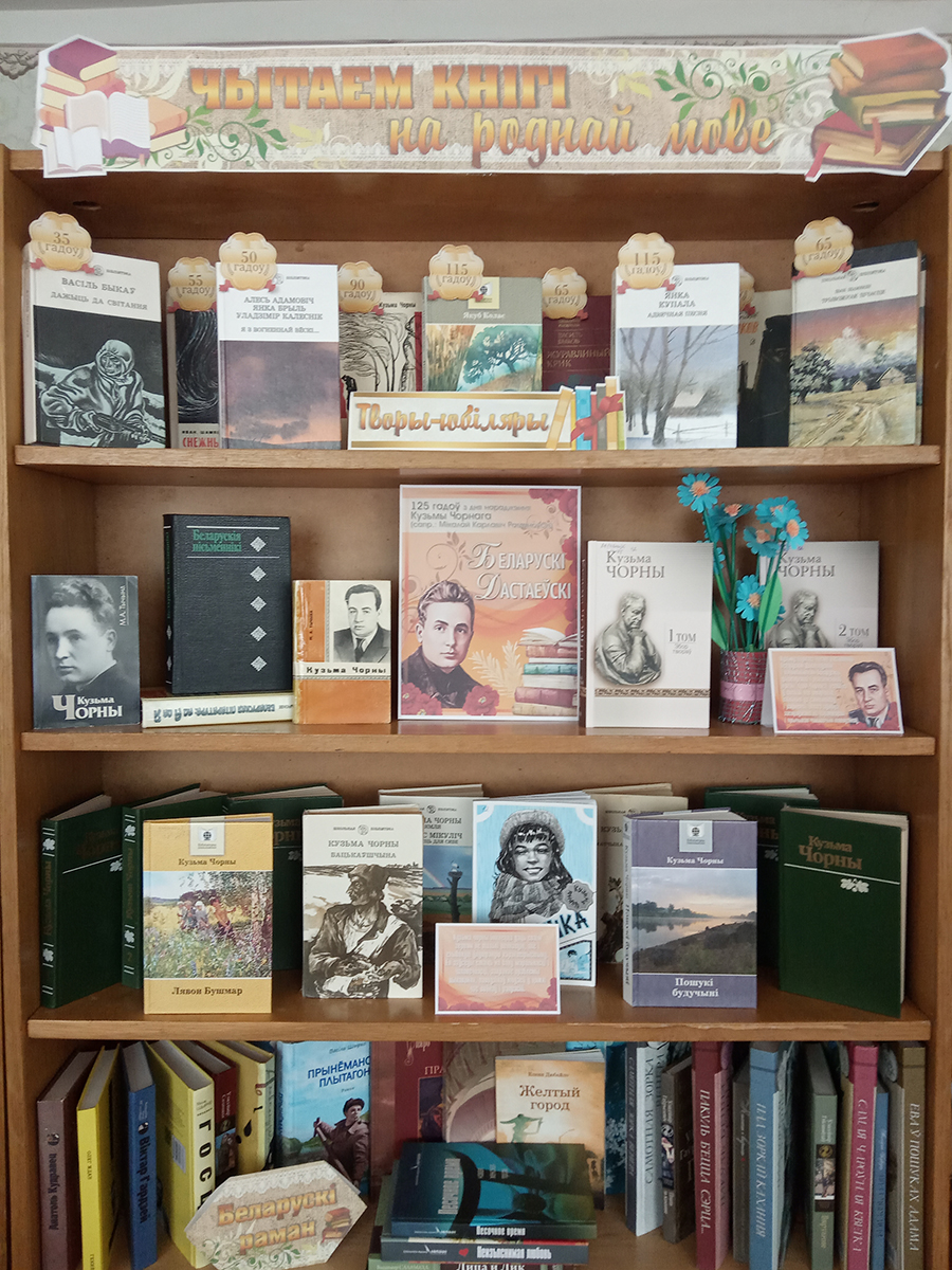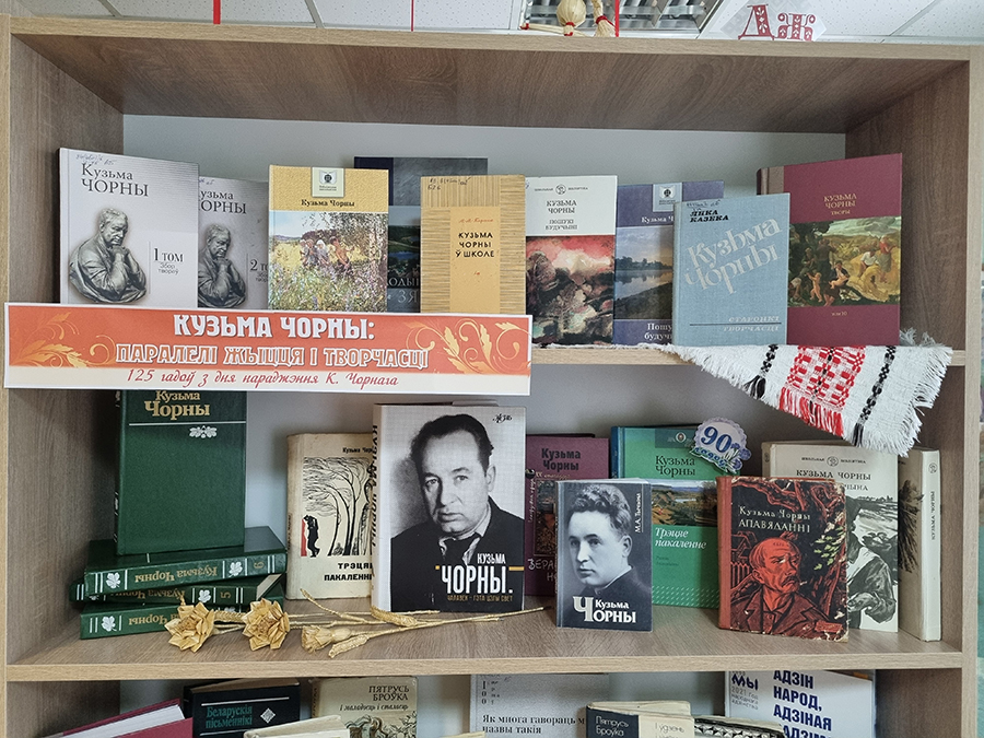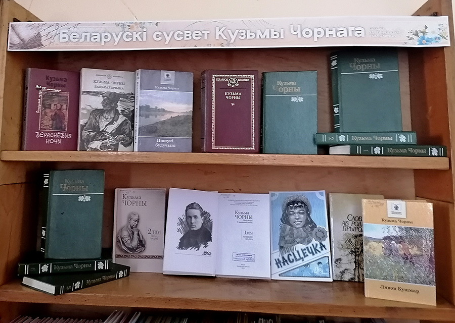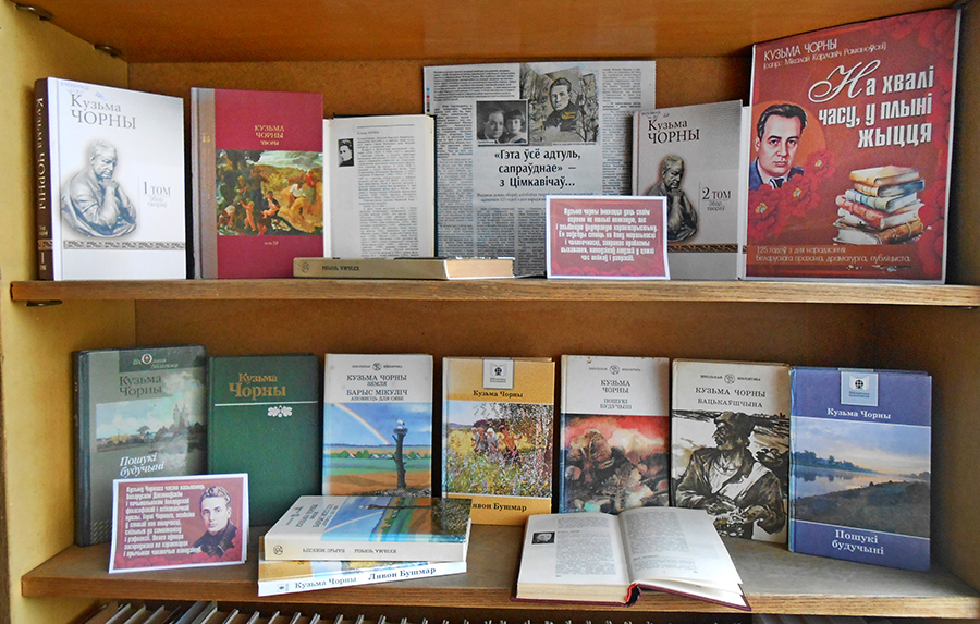У бібліятэках сеткі да юбілею пісьменніка падрыхтаваны кніжная выставы: «Кузьма Чорны: паралелі жыцця і творчасці», «Багацце душы талента», «Беларускі сусвет Кузьмы Чорнага», «Недапісаніе слова», «Празаічны вернісаж Кузьмы Чорнага», «Беларускі Дастаеўскі», «Вялікае сэрца», «На хвалі часу, у плыні жыцця». На выставах прадстаўлены кнігі белаpускага пісьменніка, а таксама кнігі і артыкулы аб літаратурным і жыццёвым шляху пісьменніка.