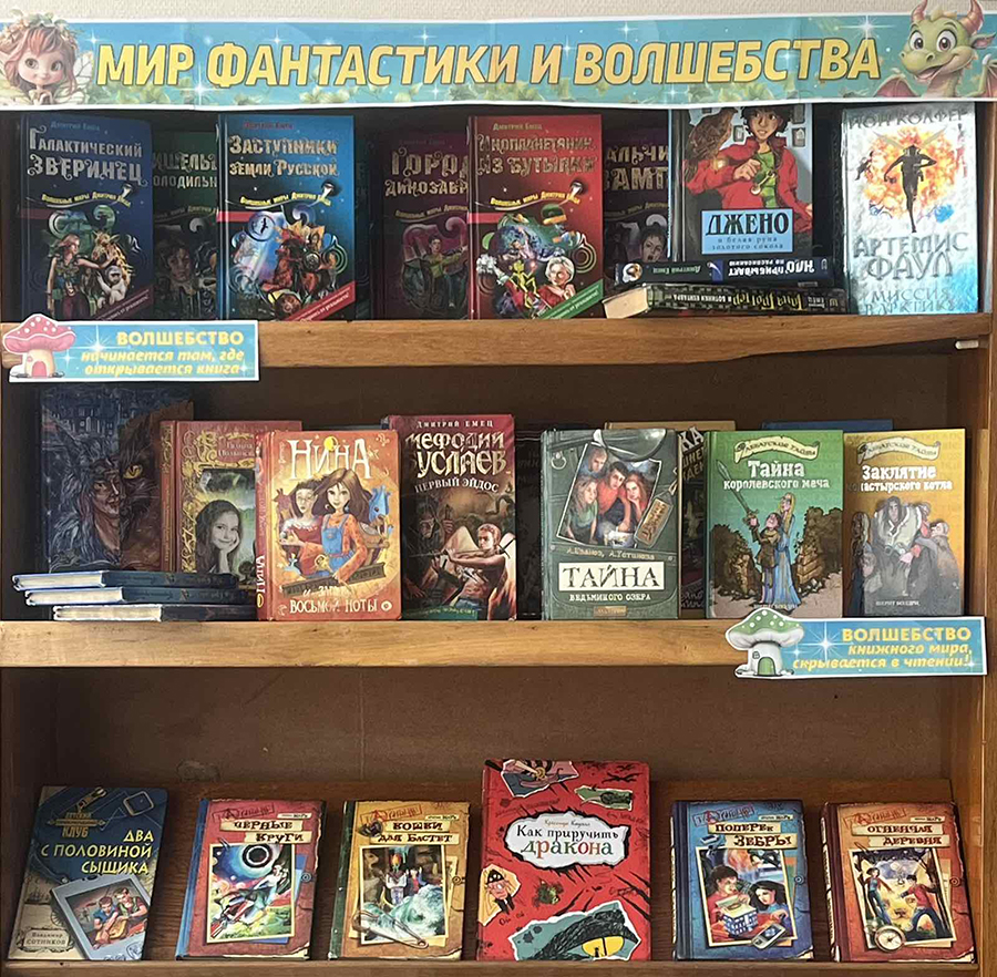 Кроме того, в библиотеках были оформлены тематические выставки: «На каникулах не скучай – бери книгу и читай», которая приглашает юных читателей провести летние дни с увлекательными историями; «С книгой летом веселей» – яркое напоминание о том, что чтение делает отдых еще более насыщенным; а также «Мир фантастики и волшебства», где собраны книги о приключениях волшебниках, космосе и фантастических мирах. Эти выставки создают уютную атмосферу для любознательных читателей всех возрастов и помогают сделать летние каникулы по-настоящему насыщенными и познавательными.