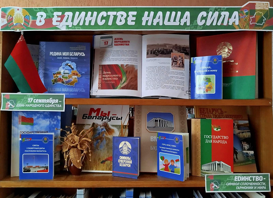 Ко Дню народного единства также были подготовлены экспозиции: «Беларусь – страна единства и согласия», «В единстве наша сила», «Беларусь единая», «Вместе мы – страна Беларусь», «Беларусь. Радзіма. Адзінства», «Для нас единство наше свято», где читатели смогли познакомиться с литературой о суверенной Беларуси, её истории, экономических успехах и социальных достижениях. Эти выставки стали важным источником знаний, расширяя представление о Родине и вдохновляя на любовь к ней.