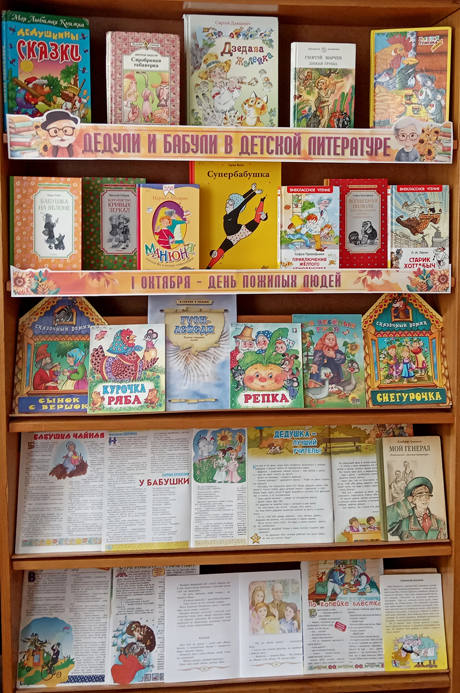 На полках читатели могли найти литературу самых разных жанров: произведения классической и современной поэзии, художественные книги о любви и семейных ценностях, детские издания, посвящённые бабушкам и дедушкам, а также издания, рассказывающие о том, как сохранять здоровье и бодрость в любом возрасте.