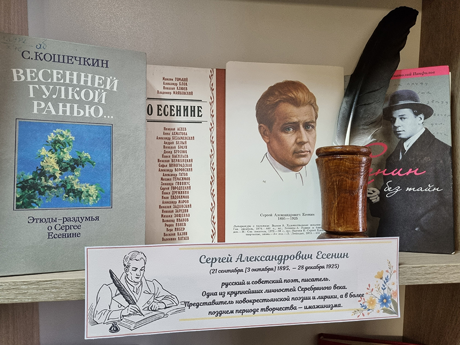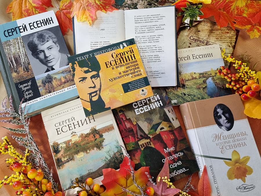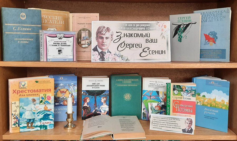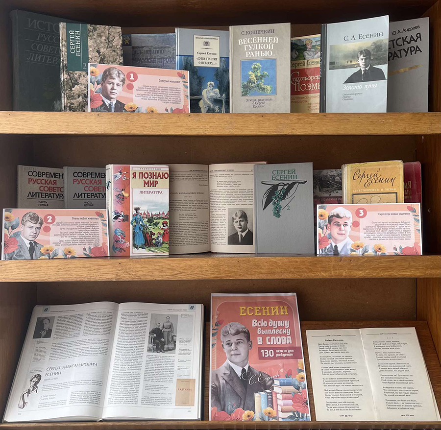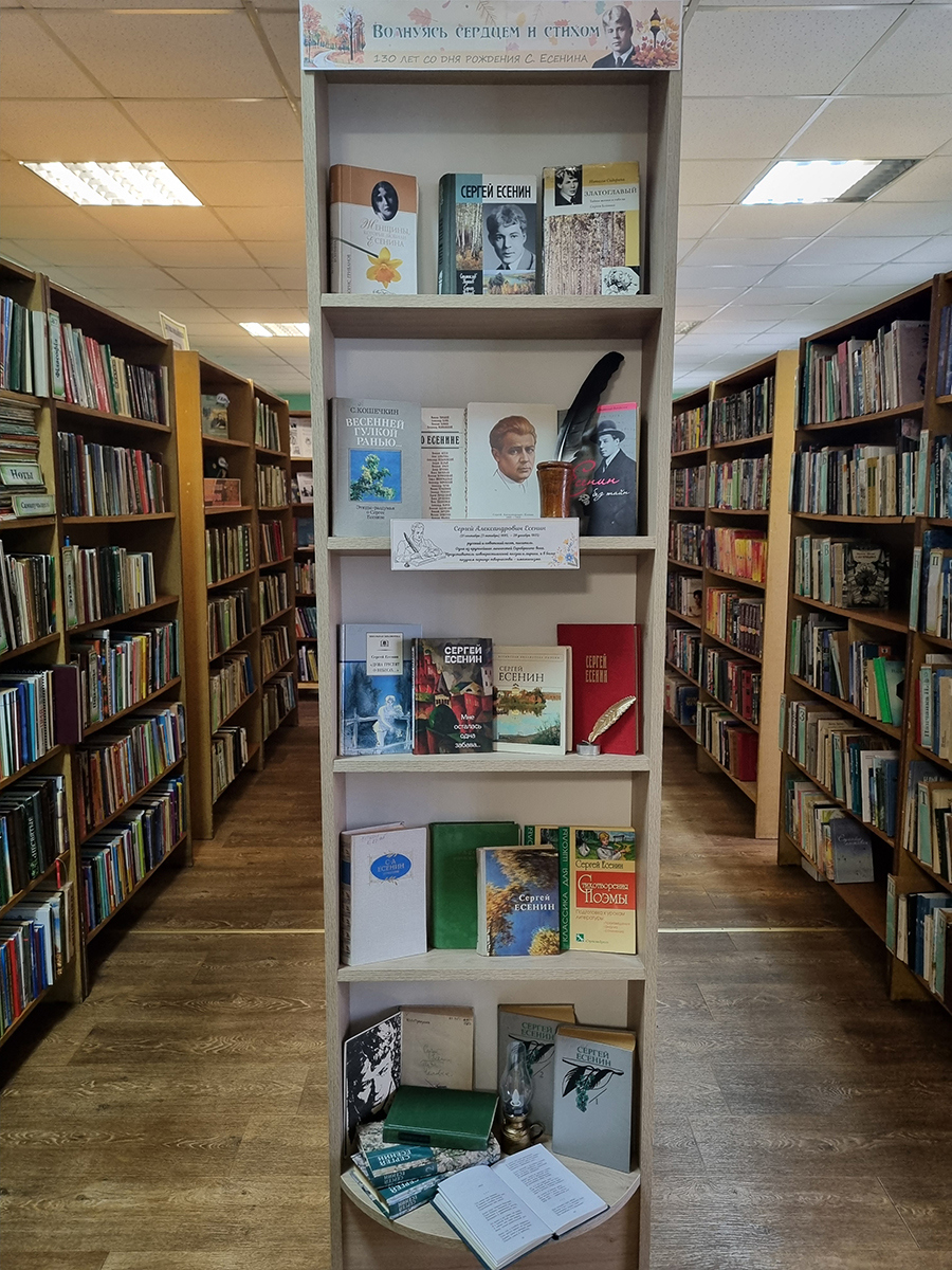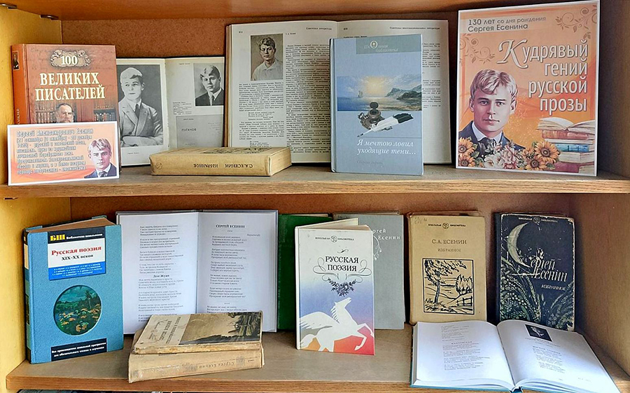 К юбилейной дате библиотеки сети подготовили красочные выставки, посвящённые жизни и творчеству этого талантливого и выразительного поэта: «Волнуясь сердцем и стихом», «Читаем Есенина», «Стихи, волнующие душу», «Знакомый ваш Сергей Есенин», «Всю душу выплесну в слова» и «Кудрявый гений русской прозы», которые создали уникальную возможность погрузиться в атмосферу его поэзии, почувствовать силу его слов и понять ту неувядаемую красоту русского языка, которую мастерски олицетворял гениальный поэт.