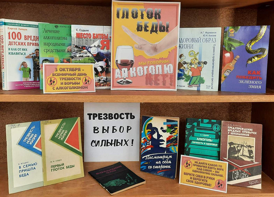 Накануне этой даты библиотекари сети подготовили информационные книжные выставки: «Глоток беды», «Алкоголизм – путь в бездну». На экспозициях представлены книги и информационные материалы, посвящённые негативным последствиям алкоголя, мотивирующие отказаться от вредных привычек и вести здоровый образ жизни.