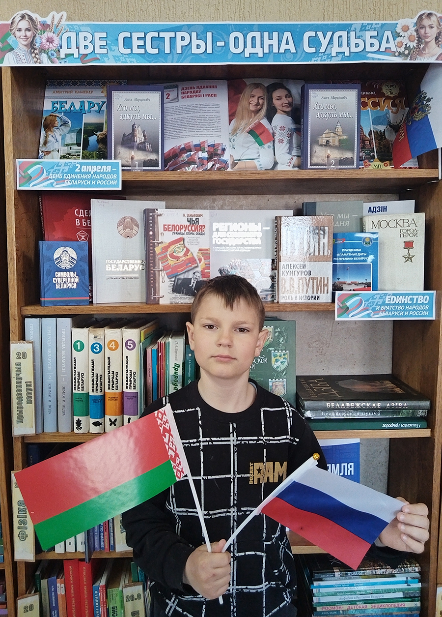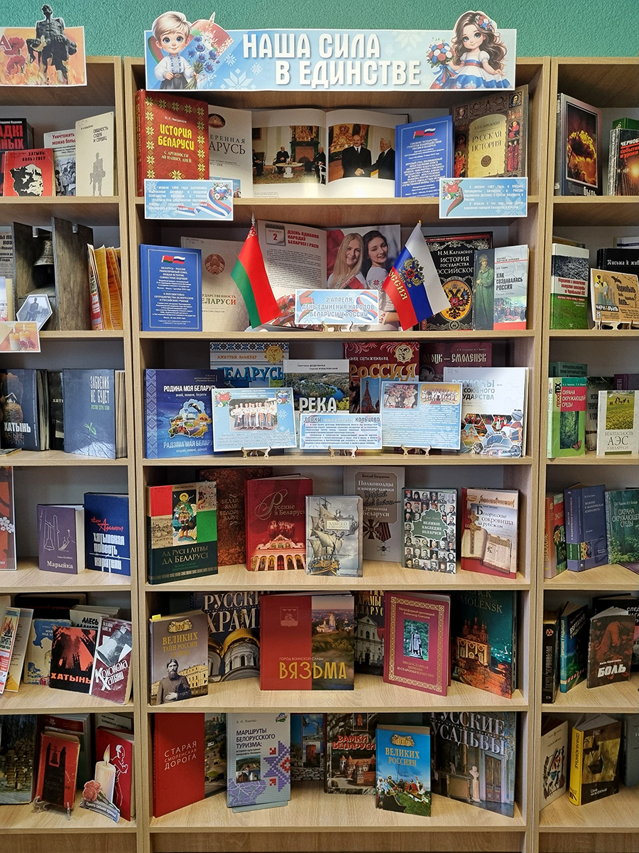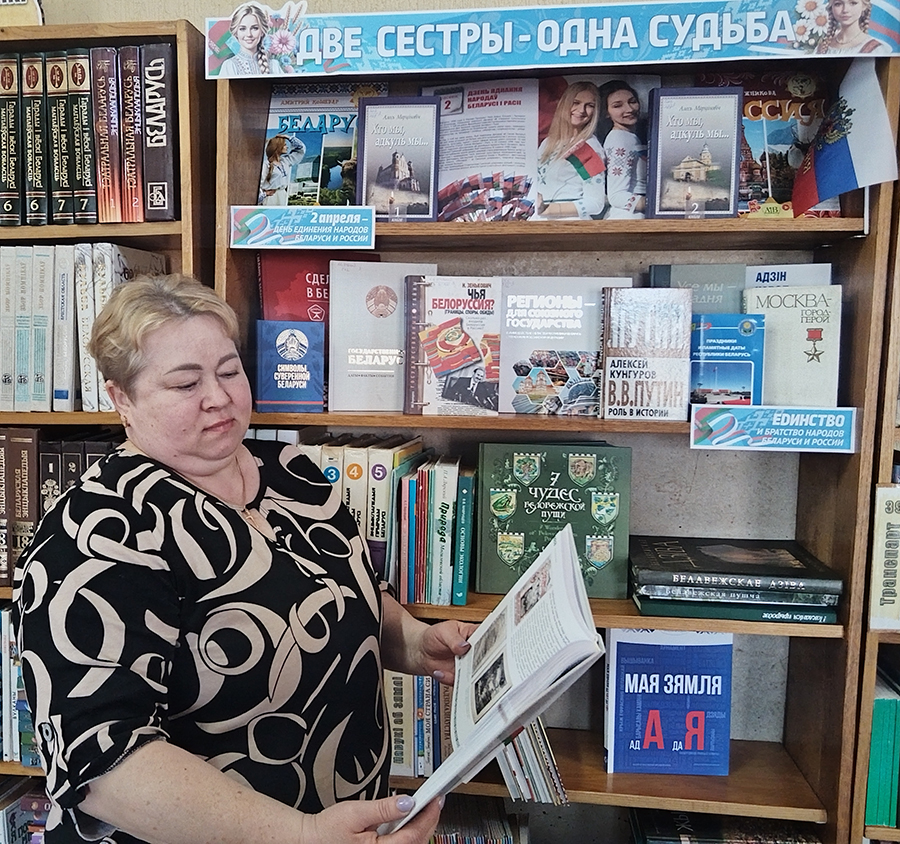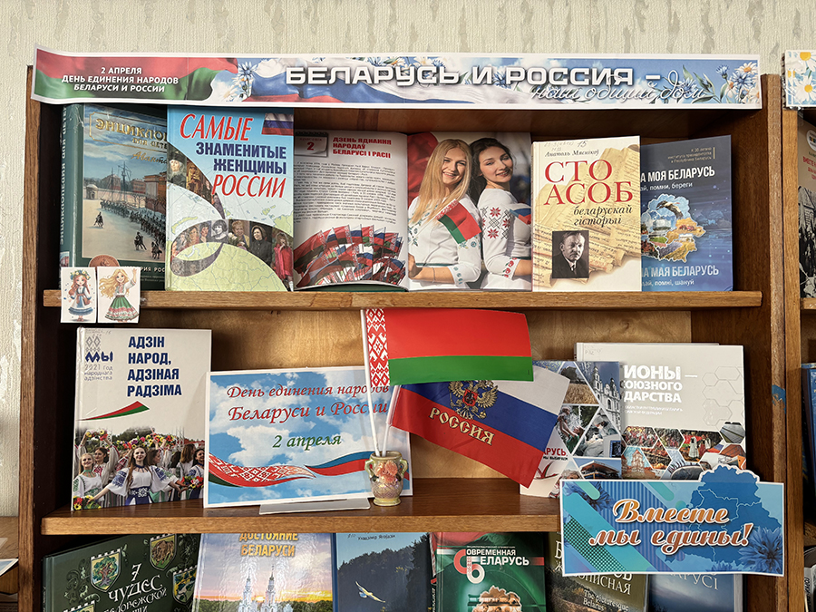 В преддверии этого знаменательного дня в библиотеках сети был оформлен ряд тематических выставок: «Две страны — одна судьба», «Братство народов: Беларусь и Россия», «Беларусь и Россия — наш общий дом», «Наша сила в единстве», «Вместе мы сила», «Беларусь — сестра России», «Единством сильны», «Беларусь и Россия: общая история, общая судьба».