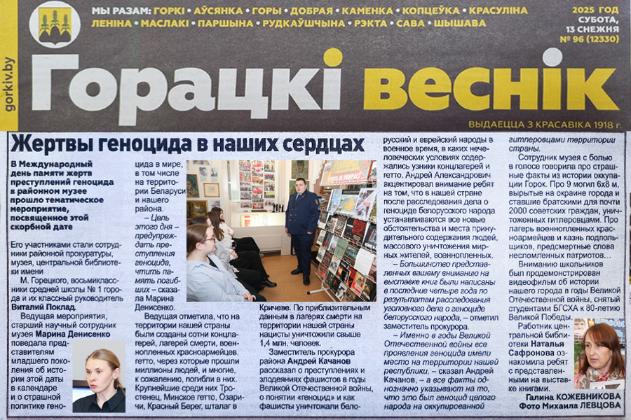 Кожевникова, Г. Жертвы геноцида в наших сердцах : [в Международный день памяти жертв преступлений геноцида в районном историко-этнографическом музее прошло тематическое мероприятие с участием центральная библиотека им. М. Горецкого] / Галина Кожевникова. – Текст : непосредственный // Горацкі веснік. – 2025. – 13 снежня. – С. 7. – URL : https://gorkiv.by/den-kotoryi-uchit-pomnit-v-raionnom-muzee-proveli-tematicheskoe-meropriyatie-o-genoczide-dlya-vosmiklassnikov/. – Дата публикации : 09.12.2025.