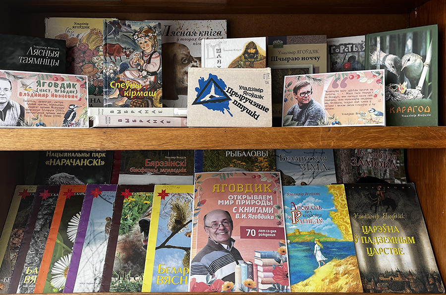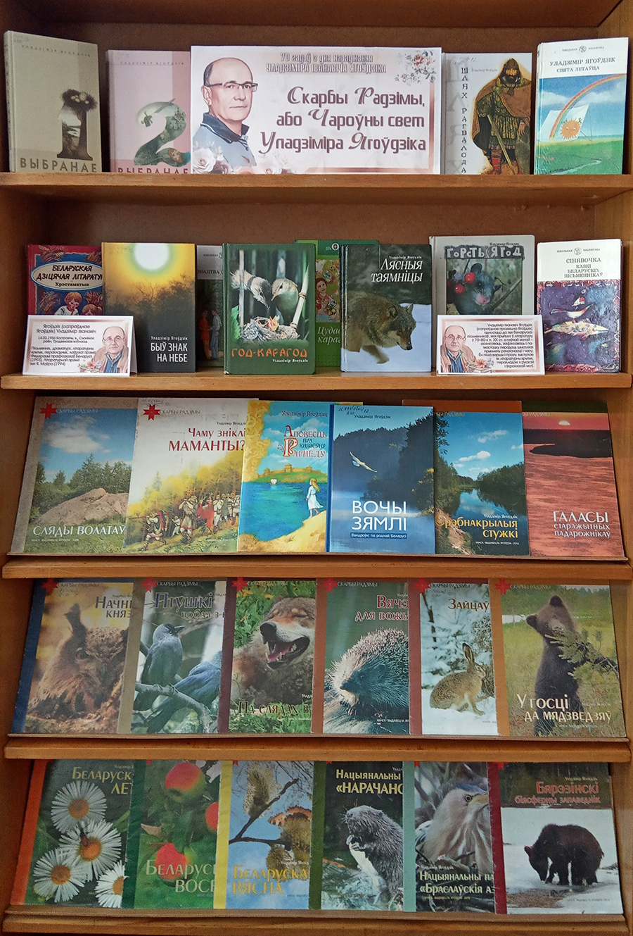 Раскрыццю мнагаграннасці талента пісьменніка ўдала садзейнічаюць кніжныя выставы, якія аформлены ў бібліятэках сеткі да юбілею пісьменніка: «Аматар і знаўца прыроды», «Мір прыроды У. Ягоўдзіка», «Цудоўны свет Ягоўдзіка», «Падарункі ад дзяцькі Ягоўдзіка», «Адкрываем мір прыроды з кнігамі У. Ягоўдзіка», «Скарбы Радзімы, або Чароўны свет Уладзіміра Ягоўдзіка», «Чароўны свет зямлі», «Зачараванне беларускай прыродай». Творы У.І. Ягоўдзіка прадстаўленыя на выставах дапамагаюць юным чытачам адчуваць прыгажосць нашай прыроды, глыбока пранікаць у яе чароўны свет. Не менш цікавымі з’яўляюцца кнігі аўтара пра гістарычнае мінулае нашай краіны, а таксама казкі.