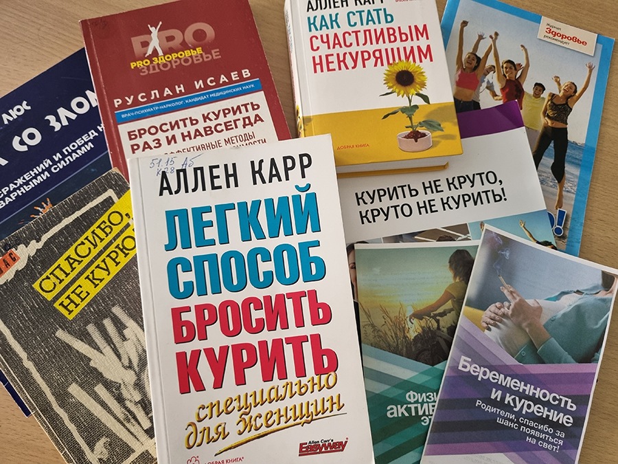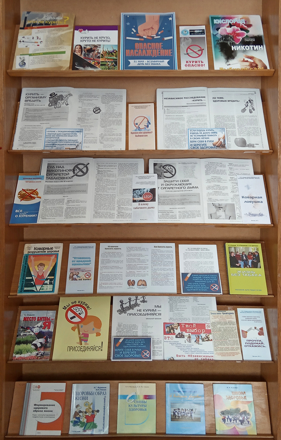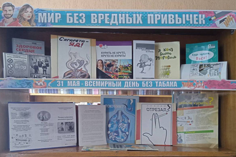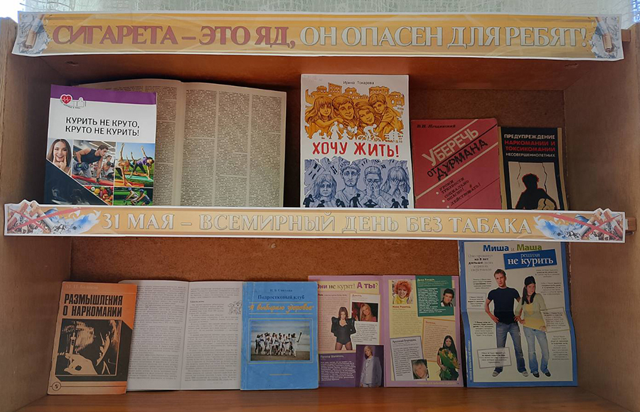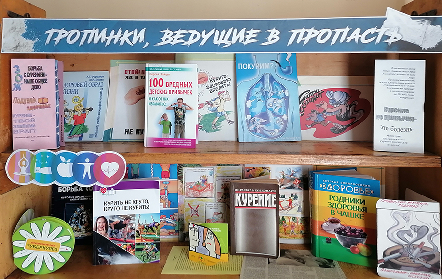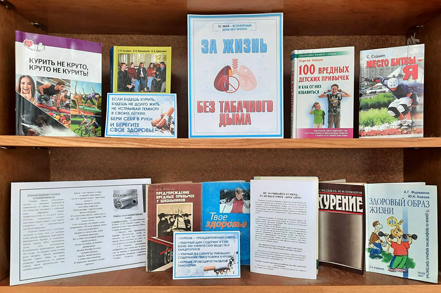 Также в библиотеках сети были оформлены тематические экспозиции: «Мир без вредных привычек», «За жизнь без табачного дыма», «Опасное наслаждение», «Тропинки, ведущие в пропасть», «Сигарета – это яд, он опасен для ребят!». На книжных выставках представлены книги и статьи о вреде курения, историях тех, кто бросил эту привычку, а также советы по здоровому образу жизни. Есть литература для подростков и молодежи, которая помогает понять важность заботы о своем здоровье и сделать правильный выбор.