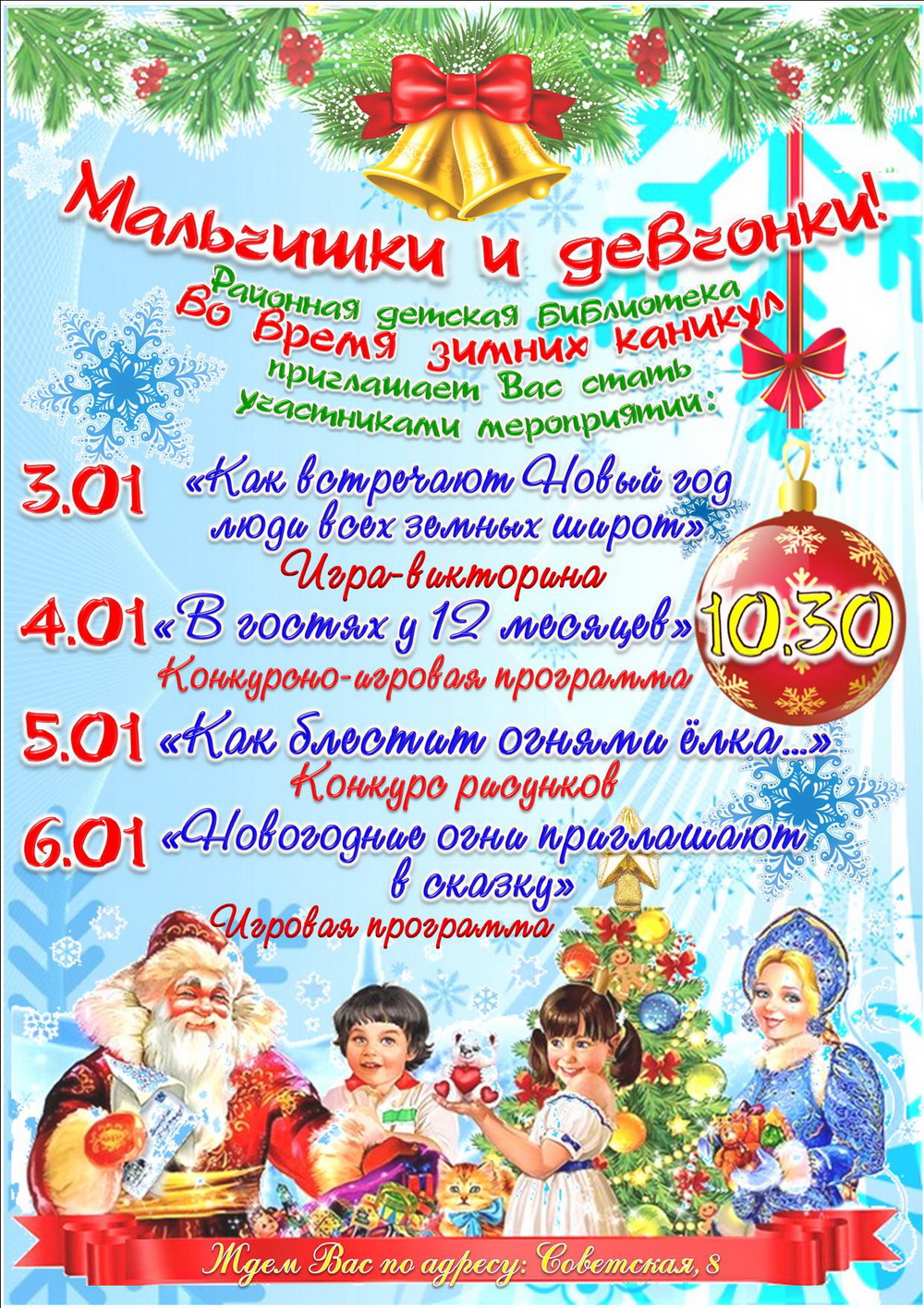 Всех! Всех! Всех! Девчонок и мальчишек, а также их родителей! Во время зимних школьных каникул районная детская библиотека приглашает на познавательные, увлекательные и развлекательные мероприятия. Вас ждут интересные конкурсы, викторины, игры и многое-многое другое! Приходите, будет весело!