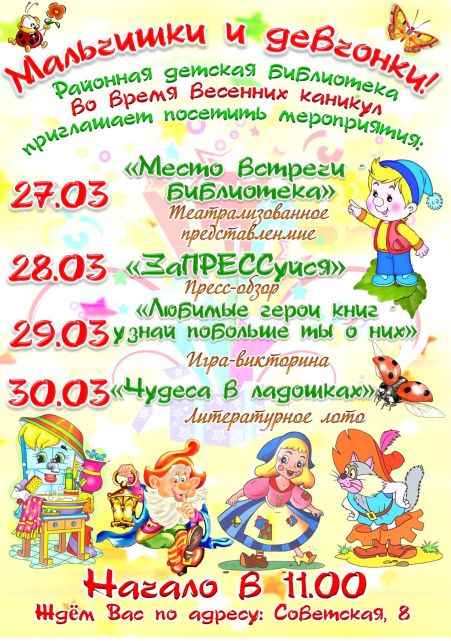 Всех! Всех! Всех! Девчонок и мальчишек, а также их родителей! Во время весенних школьных каникул районная детская библиотека приглашает на познавательные, увлекательные и развлекательные мероприятия. Вас ждут интересные конкурсы, викторины, игры и многое-многое другое! Приходите, будет весело!