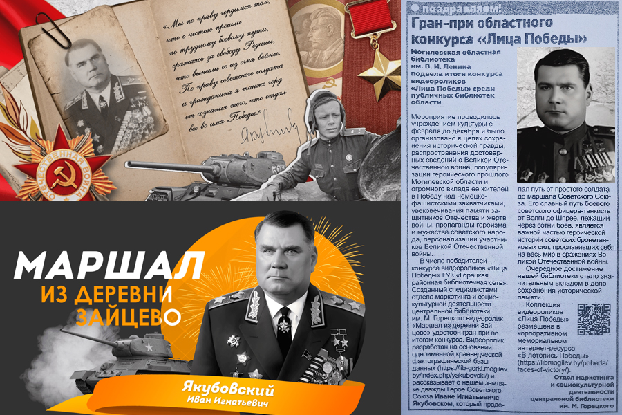Гран-при областного конкурса «Лица Победы» : Могилевская областная библиотека им. В.И. Ленина подвела итоги конкурса видеороликов «Лица Победы» среди публичных библиотек области : [Центральная библиотека им. М. Горецкого за видеоролик «Маршал из деревни Зайцево. И.И. Якубовский» удостоен Гран-при] / отдел маркетинга и социокультурной деятельности центральной библиотеки им. М. Горецкого. – Текст : непосредственный // Горацкі веснік. – 2025. – 20 снежня. – С. 11. – URL : https://gorkiv.by/guk-goreczkaya-rajonnaya-bibliotechnaya-set-pobedila-v-oblastnom-konkurse-videorolikov-licza-pobedy/. – Дата публикации : 17.12.2025.