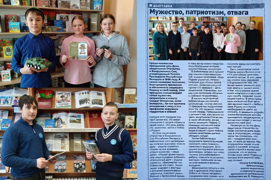 Каржуева, О. Мужество, патриотизм, отвага : [в библиотеках ГУК «Горецкая районная библиотечная сеть» ко Дню защитников Отечества оформлены книжные выставки и проведены тематические мероприятия] / Оксана Каржуева. – Тэкст : непосредственный // Горацкі веснік. – 2026. – 25 сакавіка. – С. 6. – URL : https://gorkiv.by/v-goreczkih-bibliotekah-proveli-tematicheskie-meropriyatiya-k-23-fevralya-dlya-shkolnikov/. – Дата публікацыі : 24.02.2026.