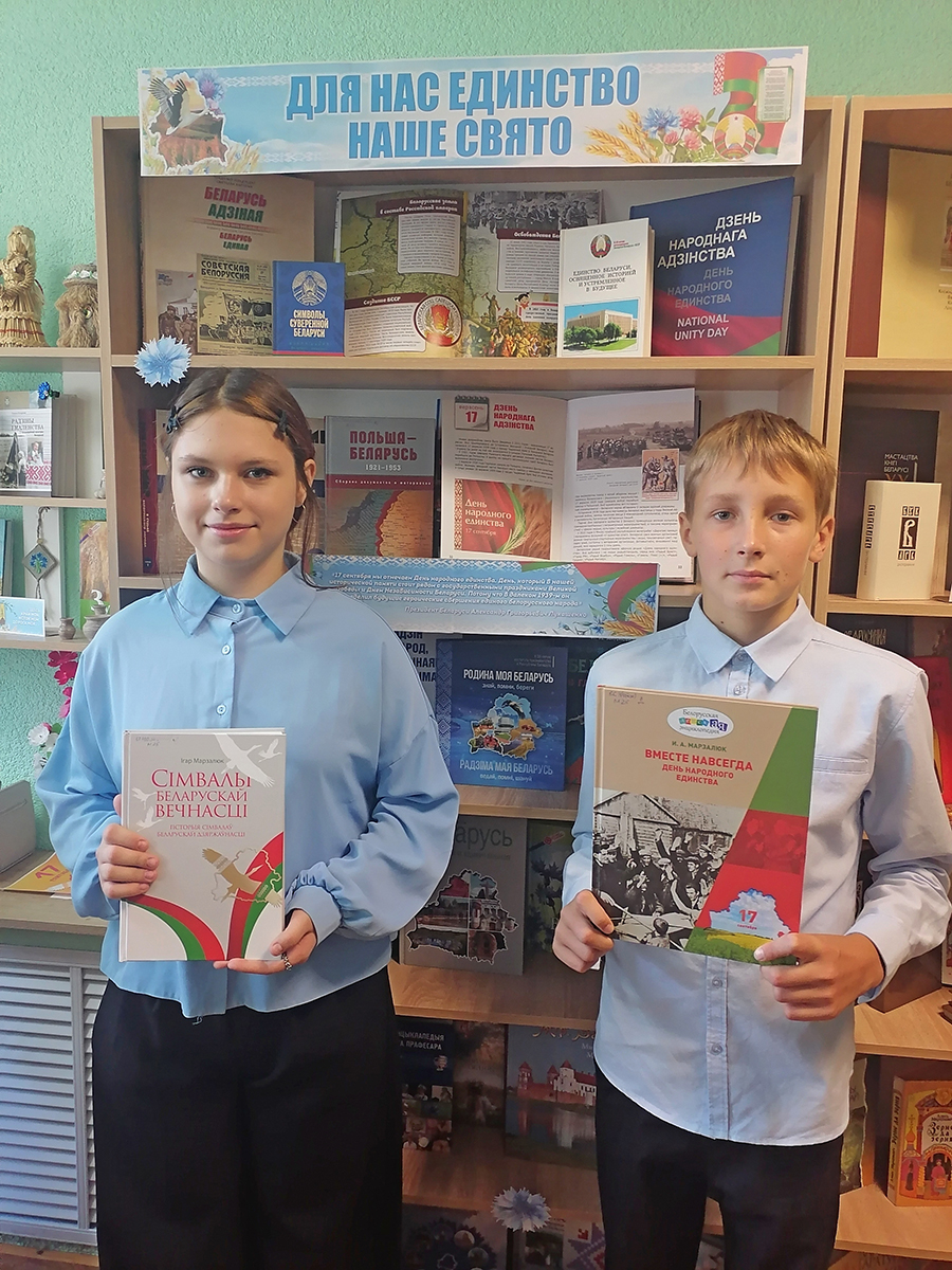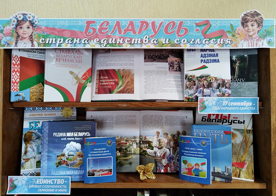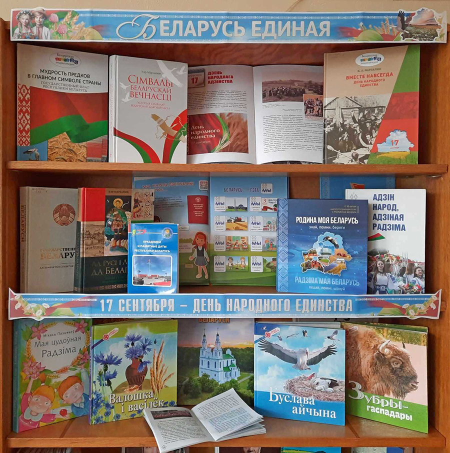 Ко Дню народного единства также были подготовлены экспозиции: «Беларусь – страна единства и согласия», «В единстве наша сила», «Беларусь единая», «Вместе мы – страна Беларусь», «Беларусь. Радзіма. Адзінства», «Для нас единство наше свято», где читатели смогли познакомиться с литературой о суверенной Беларуси, её истории, экономических успехах и социальных достижениях. Эти выставки стали важным источником знаний, расширяя представление о Родине и вдохновляя на любовь к ней.