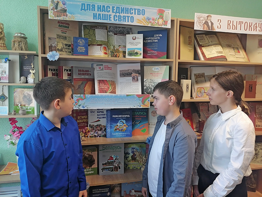 В преддверии праздничной даты сотрудники центральной библиотекари отдела обслуживания и информации для учащихся 6 «В» класса ГУО «Средняя школа №2 г. Горки» провели обзор книжной выставки «Для нас единство наше свято». В филиалах библиотечной сети прошли: обзор книжной выставки «Беларусь единая», патриотический час «Беларусь – страна единая», информационные часы «Единый народ – единая держава», «Пусть крепнет наше государство, где все едины и равны». В ходе мероприятий участники познакомились с книгами и материалами, раскрывающими историю, культуру и достижения Беларуси, а также обсудили значение национального единства для сохранения государственности и развития страны.