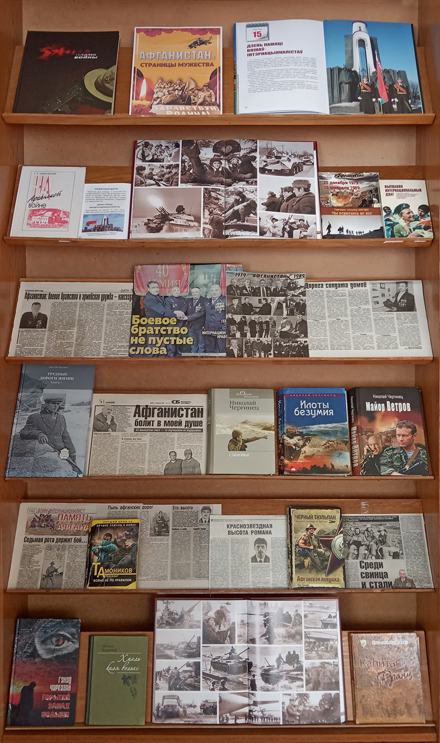 Также в библиотеках сети были подготовлены тематические выставки: «Из пламени Афганской войны 1979-1989 гг.», «Афганистан. Память и боль», «Афганистан – боль в моей душе», «Афганистан. И пусть поколения помнят», «По афганским дорогам», «Афганистан: страницы мужества», «Пока мы помним, мы живем», «Афганистан – наша память и боль», «Героям Афганской войны посвящается». На них экспонируются книги и материалы, рассказывающие о военных конфликтах, о героях, которые проявили невероятную мужество и стойкость. Также представлены свидетельства очевидцев, исторические хроники, художественная литература, поэтические сборники, воспоминания и документальные исследования. Каждая книга – это уникальный рассказ о мужестве и жертвах наших героев, о ценности мира и памяти, который помогает молодому поколению понять и сохранить важность этих событий.