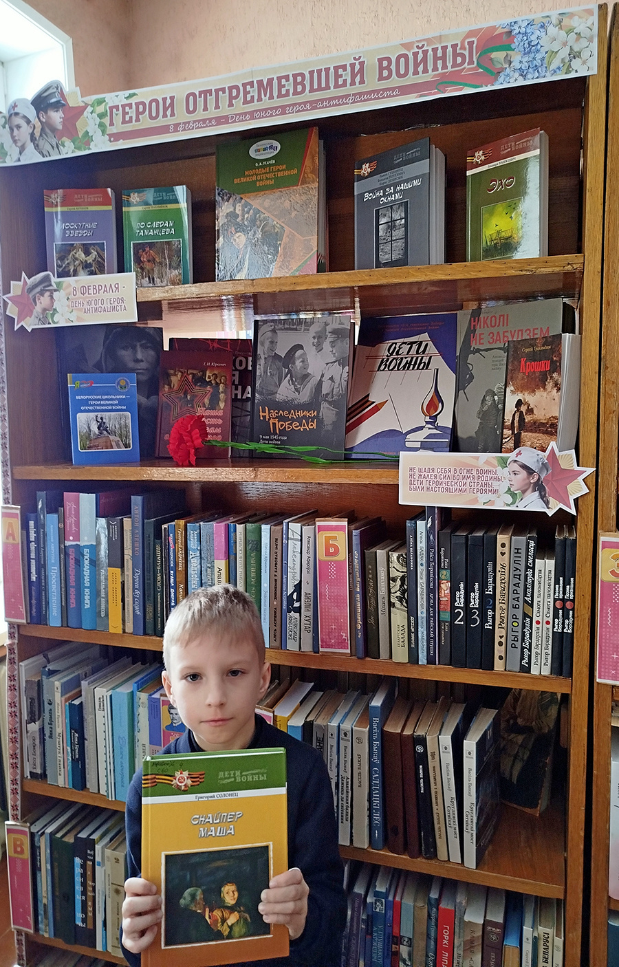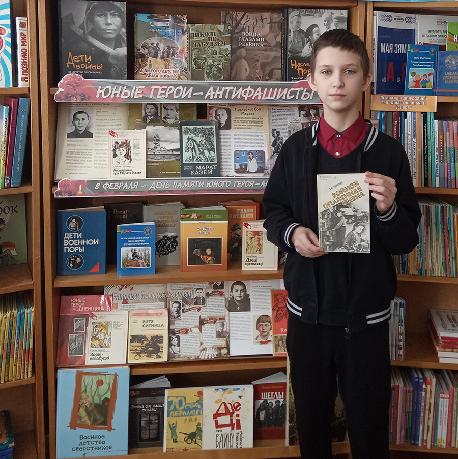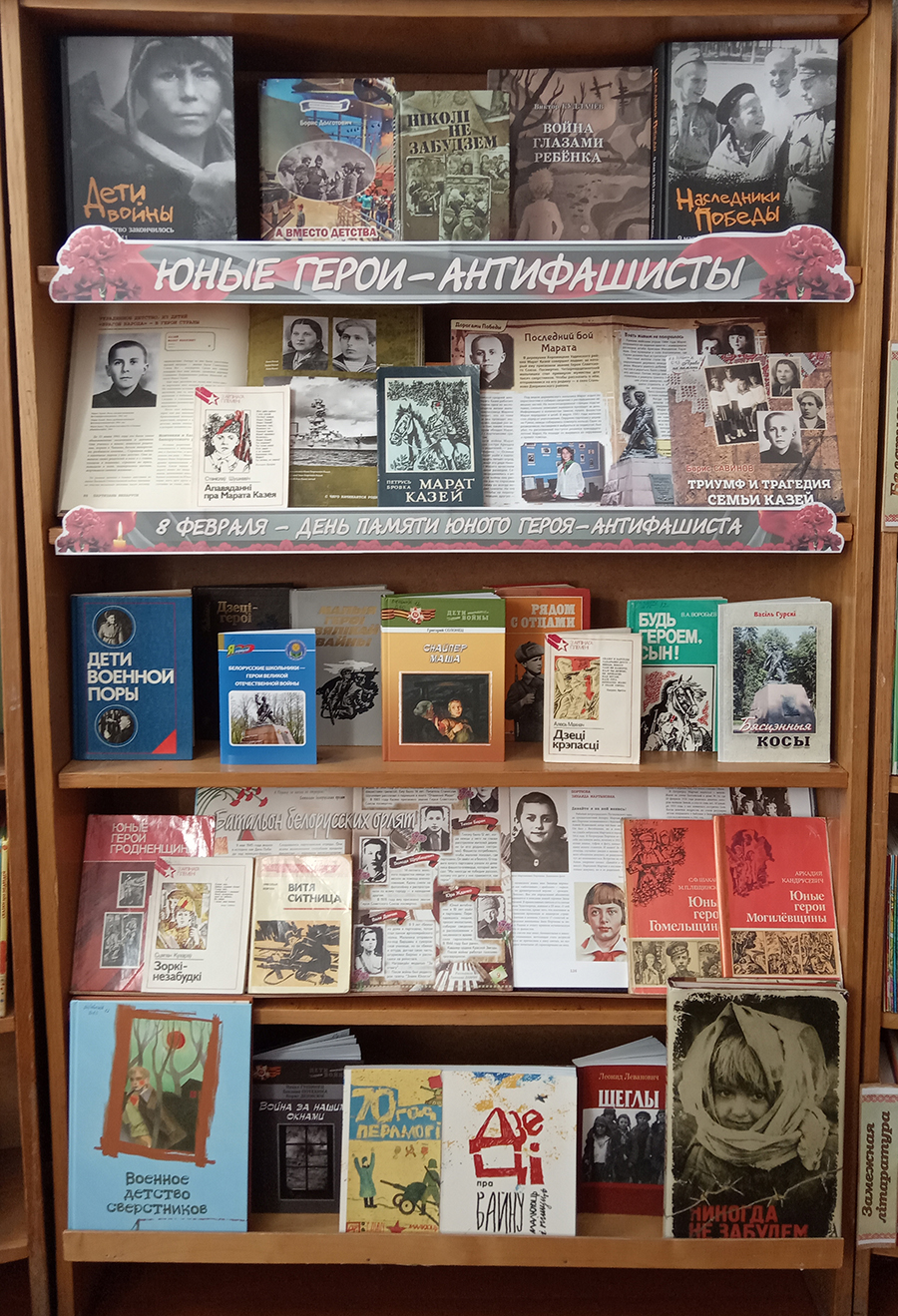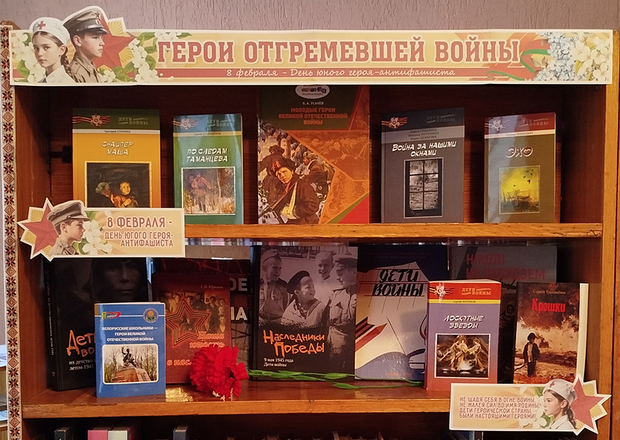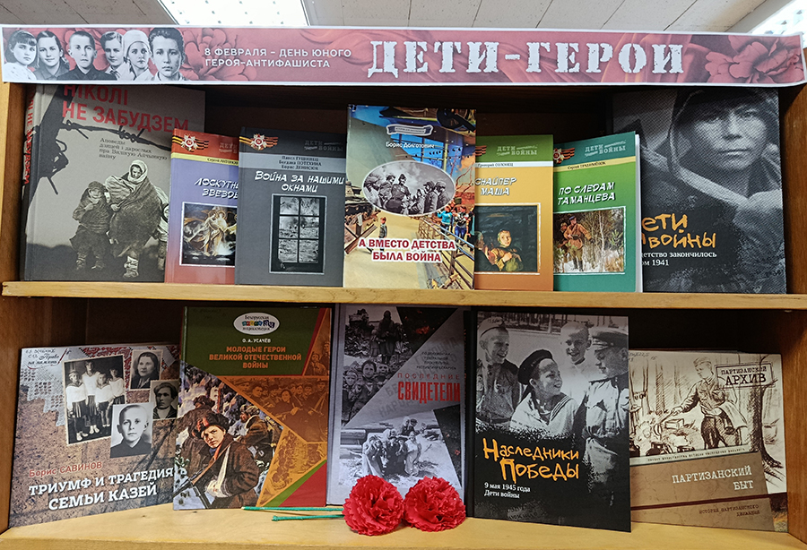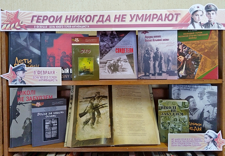К памятной дате в библиотеках сети оформлены тематические экспозиции: «Дети войны – дети Победы», «Герои никогда не умирают», «Герои отгремевшей войны», «Юные герои-антифашисты», «Дети-герои». Представленные на выставках книги – это документальные свидетельства о событиях Великой Отечественной войны и участии в ней юных бойцов. Здесь можно найти книги о юных героях, совершивших подвиги и проявивших беспримерную храбрость. Они посвящены памяти юных мальчиков и девочек, тех, кто сражался и умирал за свободу, равенство и счастье людей.