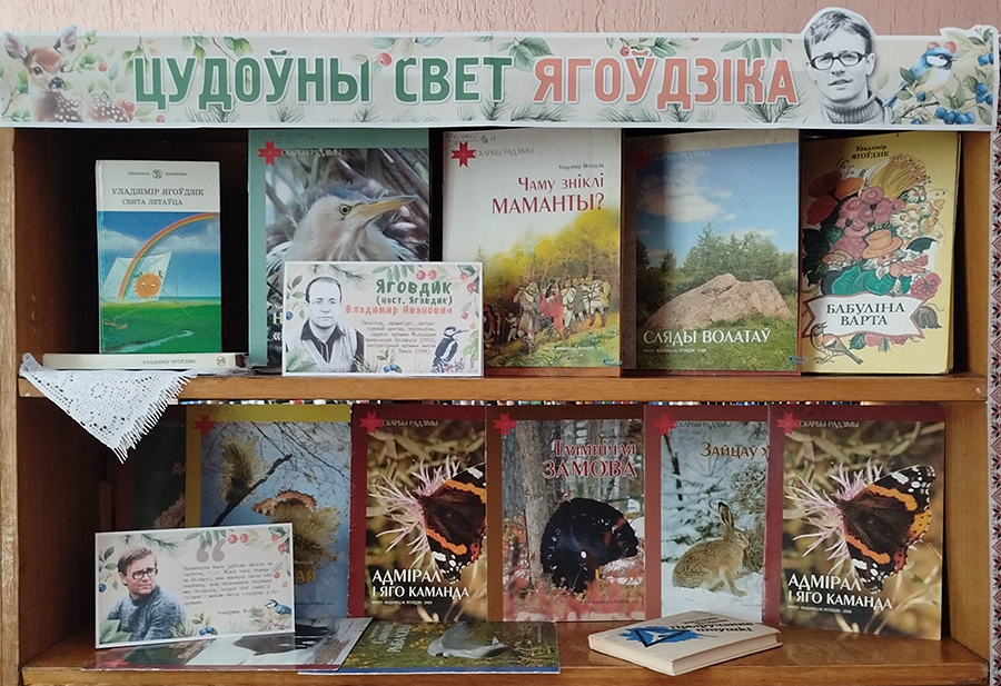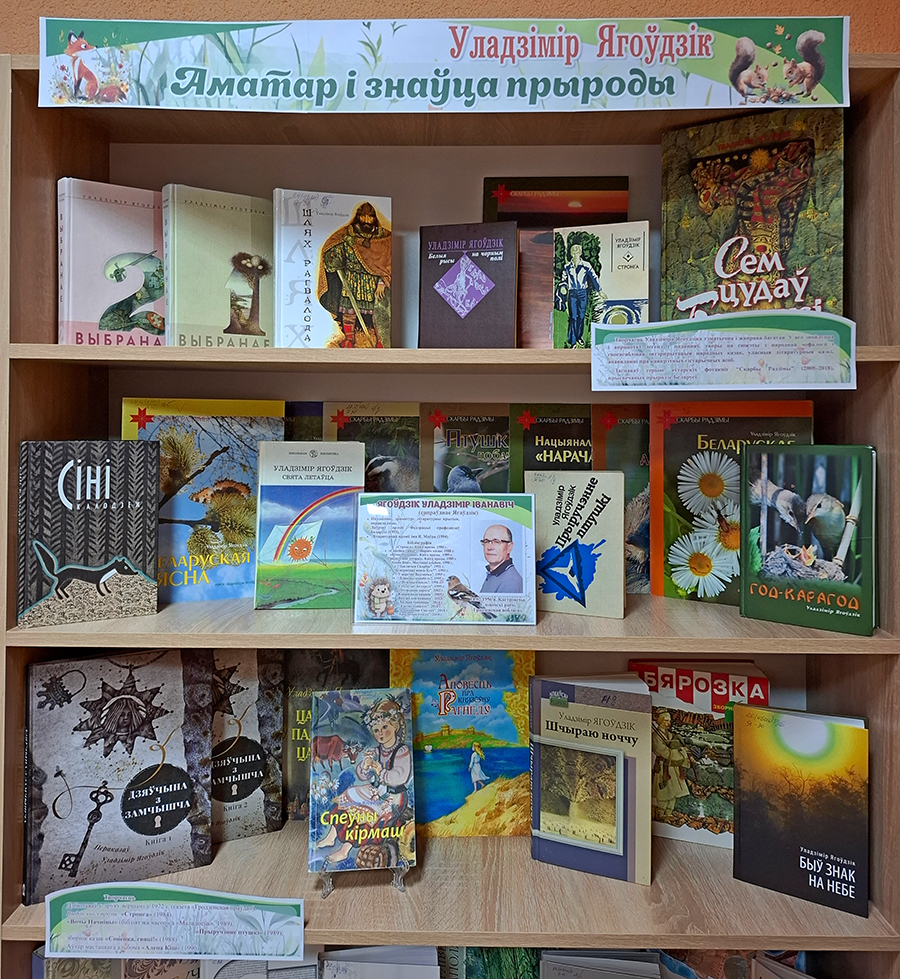 Раскрыццю мнагаграннасці талента пісьменніка ўдала садзейнічаюць кніжныя выставы, якія аформлены ў бібліятэках сеткі да юбілею пісьменніка: «Аматар і знаўца прыроды», «Мір прыроды У. Ягоўдзіка», «Цудоўны свет Ягоўдзіка», «Падарункі ад дзяцькі Ягоўдзіка», «Адкрываем мір прыроды з кнігамі У. Ягоўдзіка», «Скарбы Радзімы, або Чароўны свет Уладзіміра Ягоўдзіка», «Чароўны свет зямлі», «Зачараванне беларускай прыродай». Творы У.І. Ягоўдзіка прадстаўленыя на выставах дапамагаюць юным чытачам адчуваць прыгажосць нашай прыроды, глыбока пранікаць у яе чароўны свет. Не менш цікавымі з’яўляюцца кнігі аўтара пра гістарычнае мінулае нашай краіны, а таксама казкі.