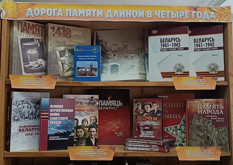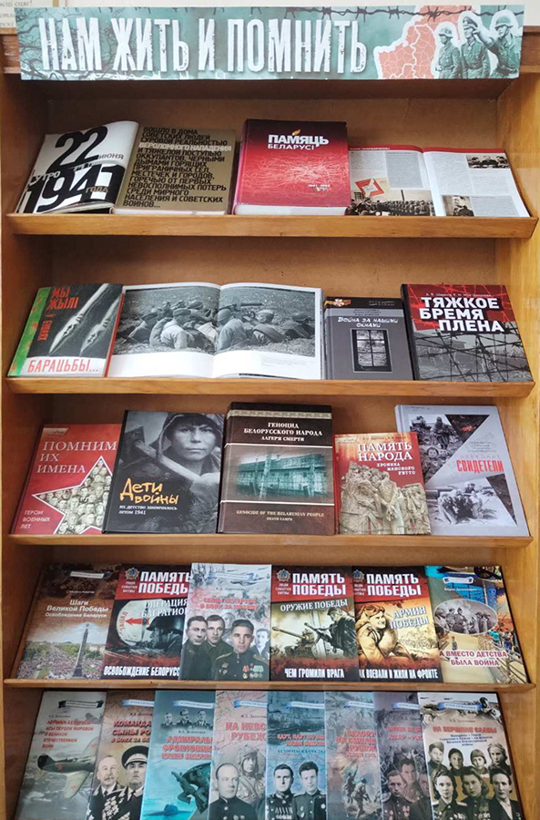 Вниманию посетителей представлены книги о начале войны, о героизме и самопожертвовании советских солдат, о детях, которые своим трудом и храбростью помогали фронту. В основу экспозиций также положены сведения, разоблачающие преступления нацизма, и архивные материалы, собранные Генеральной прокуратурой Республики Беларусь в ходе расследования уголовного дела, возбужденного в апреле 2021 года по факту уничтожения белорусов. Также на выставках представлена литература, авторы которой рассказывают о сожженных деревнях, концентрационных лагерях и гетто, созданных фашистами на территории Беларуси.