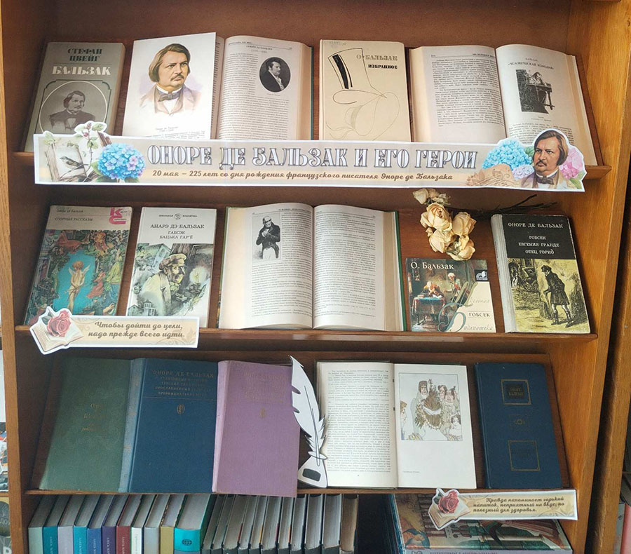 К 225-летнему юбилею французского писателя Оноре де Бальзака в библиотеках сети оформлены книжные выставки «Психолог души человеческой», «Человеческая комедия Бальзака», «Бальзак и его герои», «Великий и знаменитый». На выставках представлены литературно-критические статьи, очерки, пьесы, а также широко известные романы великого французского писателя: «Гобсек», «Шагреневая кожа», «Утраченные иллюзии», «Отец Горио», «Тридцатилетняя женщина», «Евгения Гранде» и другие. Экспозиции приблизят читателя к пониманию эпохи и помогут раскрыть тайны творчества отца европейского реализма.
