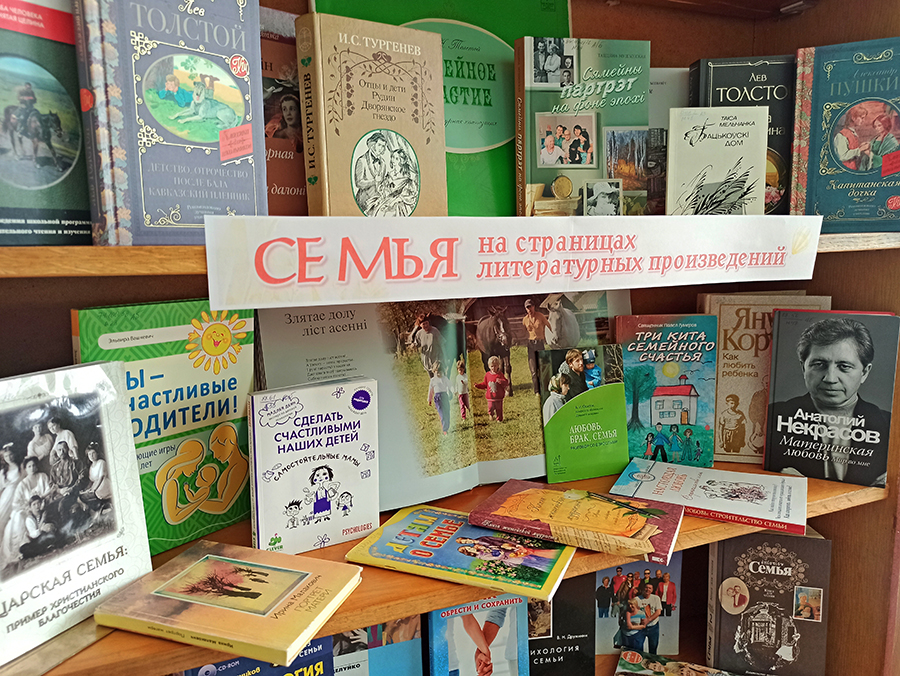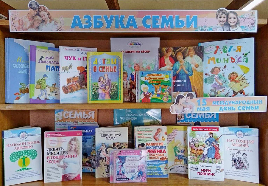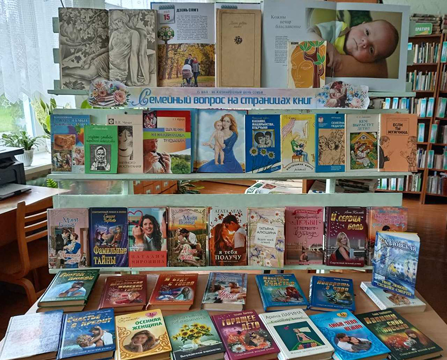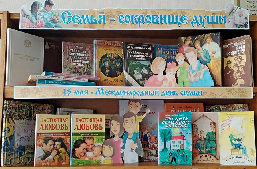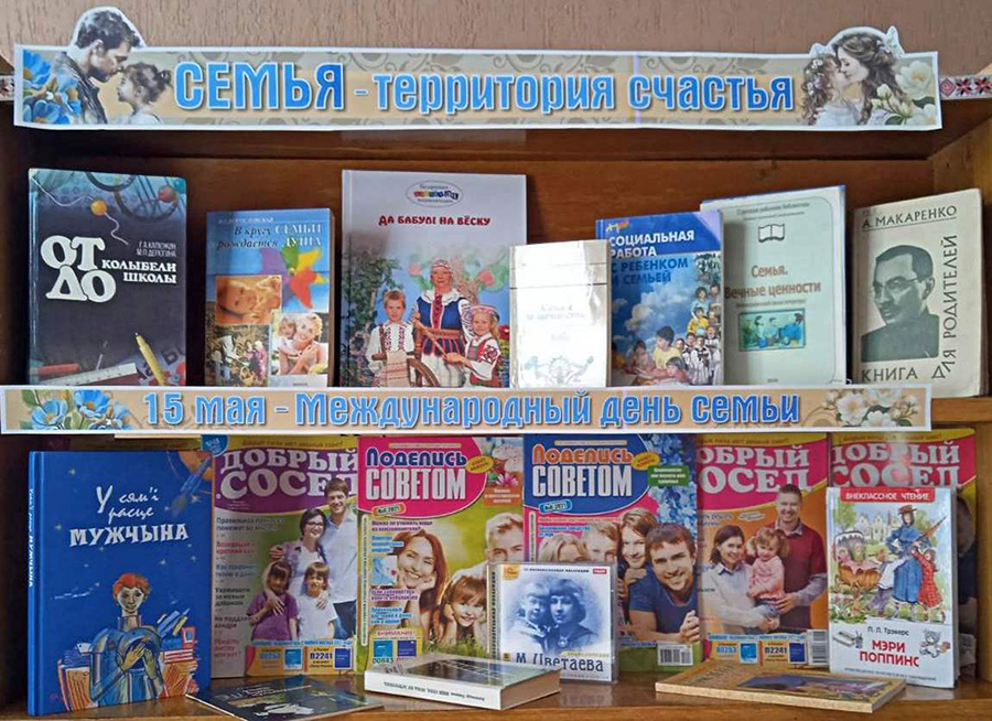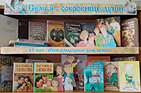 Ко Дню семьи в рамках республиканской акции «Моя семья – моя страна» в библиотеках сети оформлен ряд тематических выставок: «Семья на страницах литературных произведений», «Моя семья – моя радость», «Азбука семьи», «Семья территория счастья», «Семья – сокровище души», «Мир семьи на страницах литературных произведений», «Счастье быть семьей», «Наша дружная семья», «Семья – это то, что с тобою всегда!», «Семейный вопрос на страницах книг».