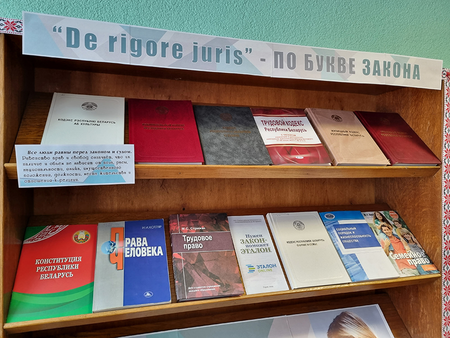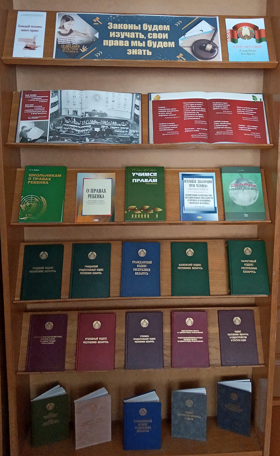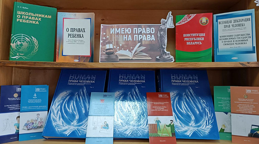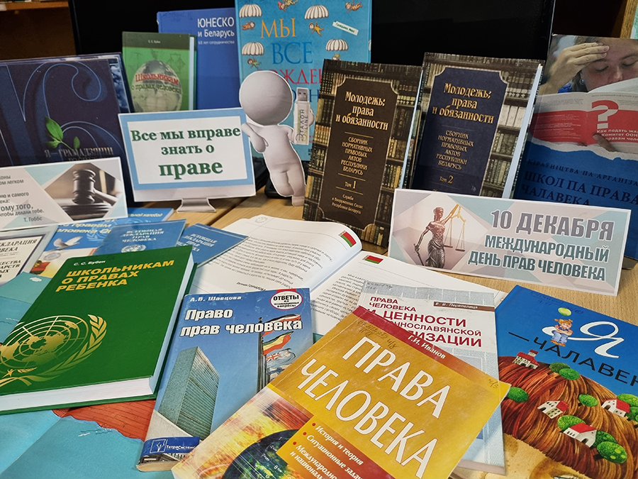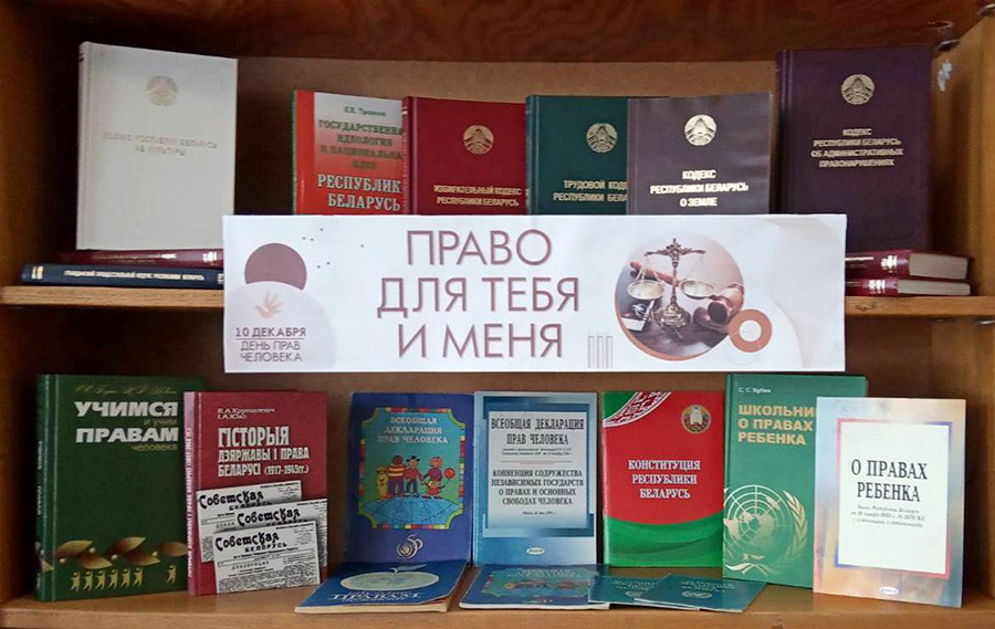 «В мире права и закона», посвященные Международному дню прав человека. Посетители могут ознакомиться с документами по вопросам прав человека. Издания, представленные на выставках, помогут читателям в изучении своих прав и обязанностей, познакомят со Всеобщей декларацией прав человека, международными документами, законодательными актами Республики Беларусь по правам человека, другими материалами.