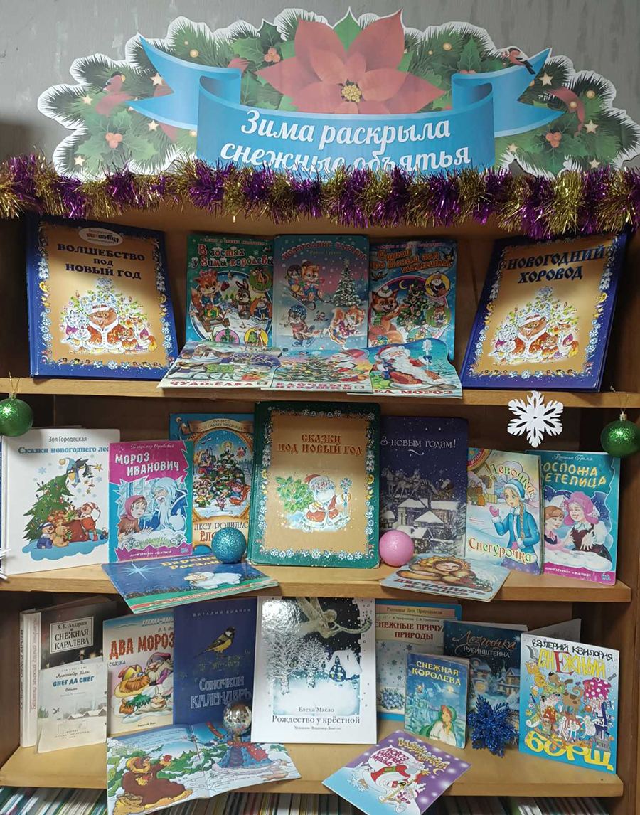 В рамках зимних каникул библиотеки сети подготовили разнообразные и познавательные выставки: «Новый год и Рождество – волшебство и колдовство», «Эти чудесные сказки», «С Новым годом и Рождеством», «Зима рассказывает сказки», «По страницам зимних сказок», «Зима раскрыла снежные объятья», «Зимняя библиотека», «Волшебство зимней сказки».