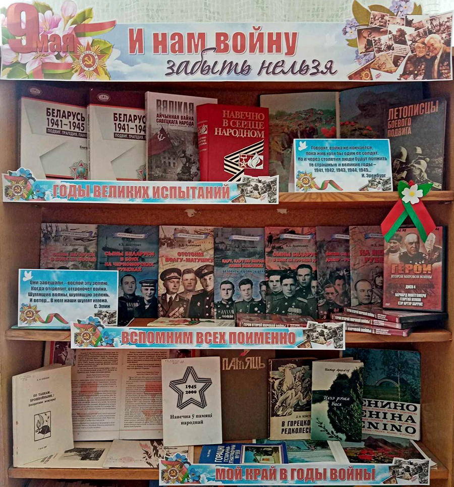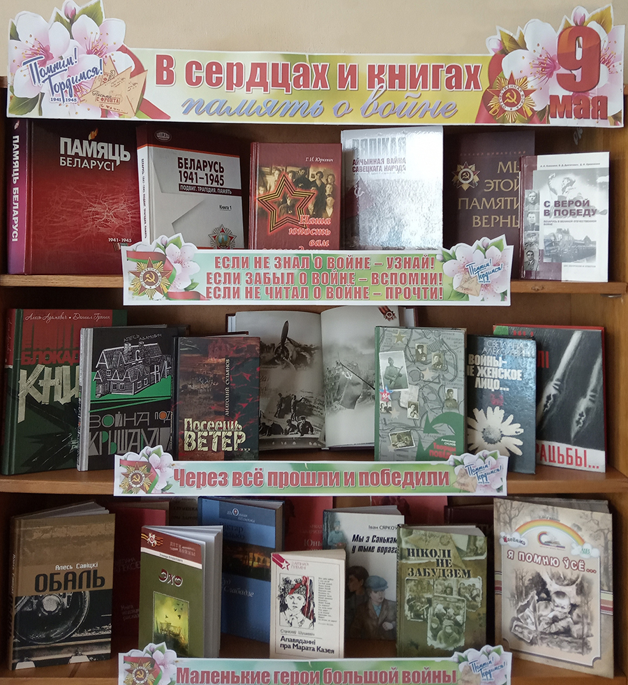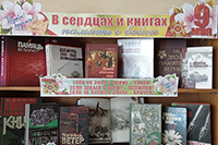 «В сердцах и книгах – память о войне», «И нам войну забыть нельзя», «О войне расскажет книга», «И снова май, цветы, салют, Победа!», «И нам войну забыть нельзя». Вниманию читателей предлагалась обширная литература о Великой Отечественной войне: книги о городах-героях, книги, рассказывающие о событиях тех лет, о героях войны, книга Памяти, также была представлена и художественная литература, книги стихов и песен о войне, хрестоматии, энциклопедии.