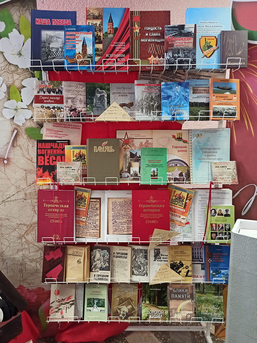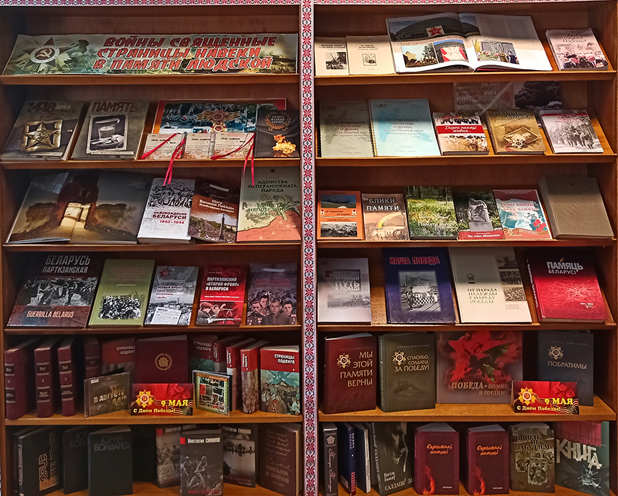 Особая роль в сохранении и укреплении благородной памяти о героическом прошлом принадлежит книгам, в которых увековечен этот подвиг. Поэтому каждый год центральная библиотека им. М. Горецкого традиционно принимает самое активное участие в районном праздновании Дня Победы – подготавливает тематические книжные выставки, оформляет экспозиции, вносит свой вклад в краеведческую работу, направленную на воспитание и сохранение в людской памяти гордости за свой народ и Родину.