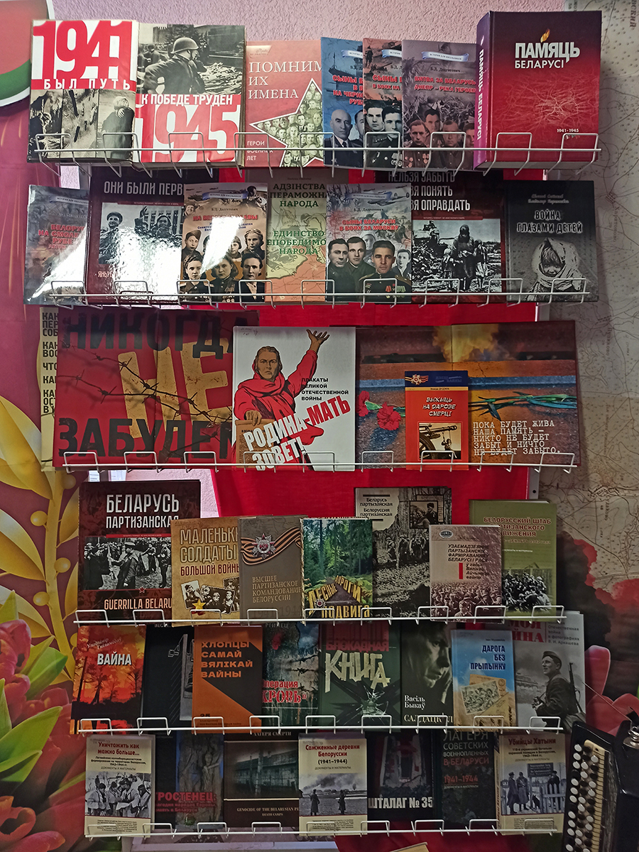 На полках собрано множество мемуаристической литературы: среди авторов воспоминаний – наши земляки, принявшие непосредственное участие в тех трагических событиях (Д. Войстров, И. Стельмашонок, С. Сидоров, И. Якубовский, Г. Дольников и другие). На страницах их книг, написанных живым языком очевидцев, перед читателями словно заново оживают картины военного лихолетья,