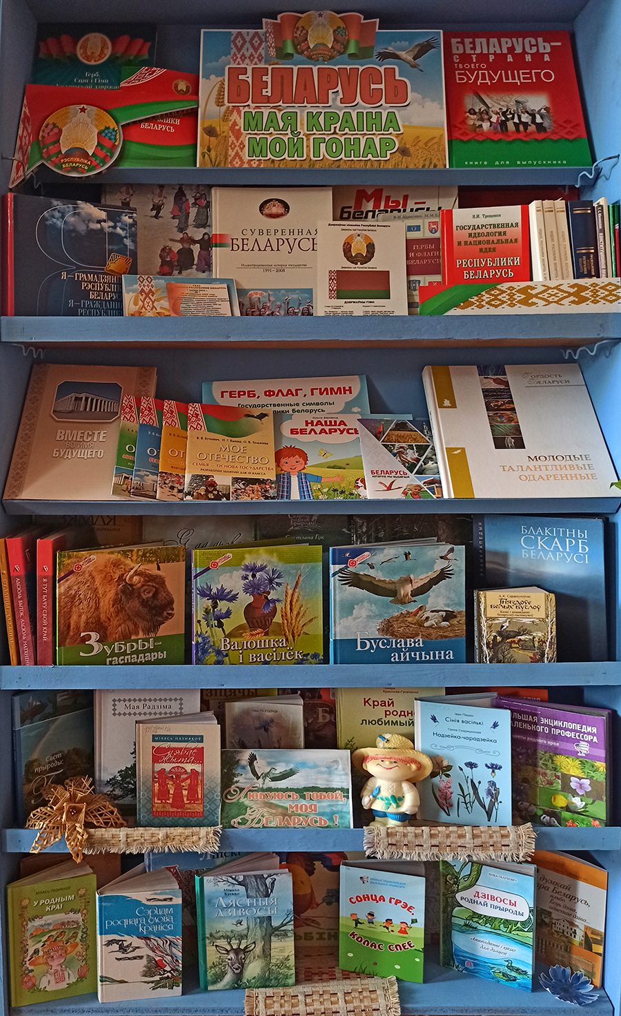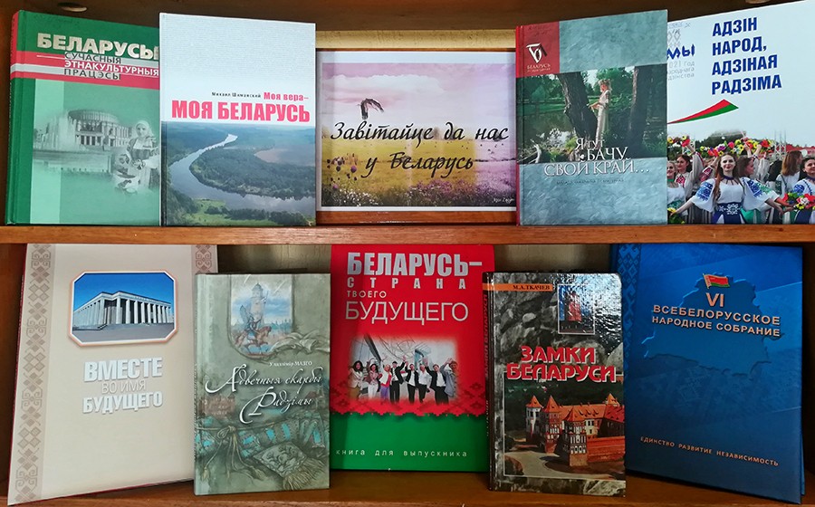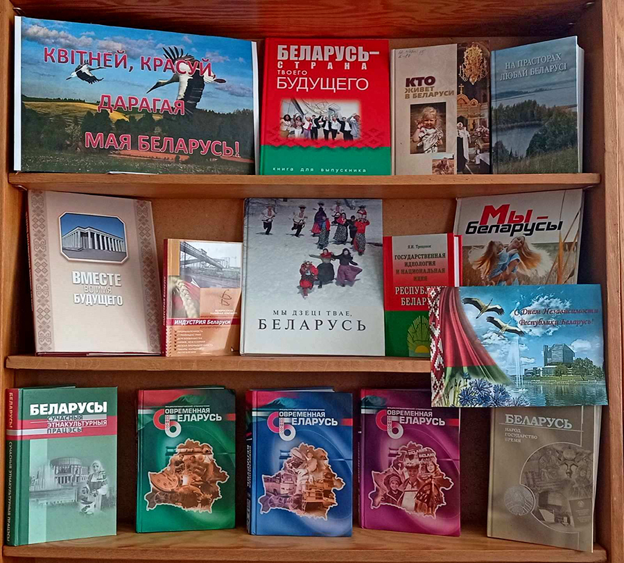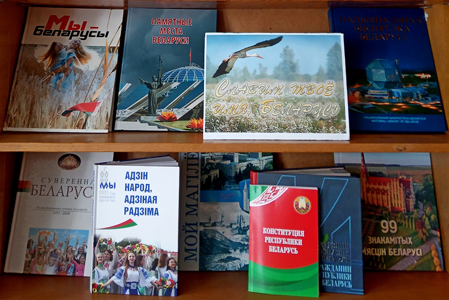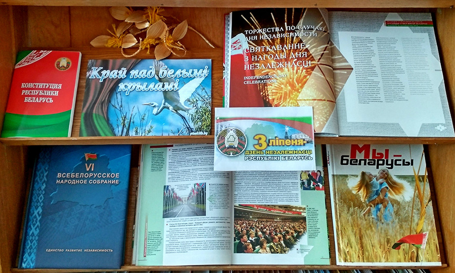 Также в библиотеках были оформлены выставки и тематические полки: «Беларусь на кніжных старонках», «Беларусь: мая краіна, мой гонар», «Завітайце да нас у Беларусь», «Славим твое имя, Беларусь», «Край пад белымі крыламі», «Квітней, красуй, дарагая мая Беларусь!», «Беларусь моя, родной край». Издания, представленные на выставках, изображают государственную символику, знакомят читателя с историческим прошлым, современными политическими, социально-экономическими и культурными аспектами жизни Республики Беларусь.