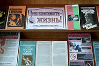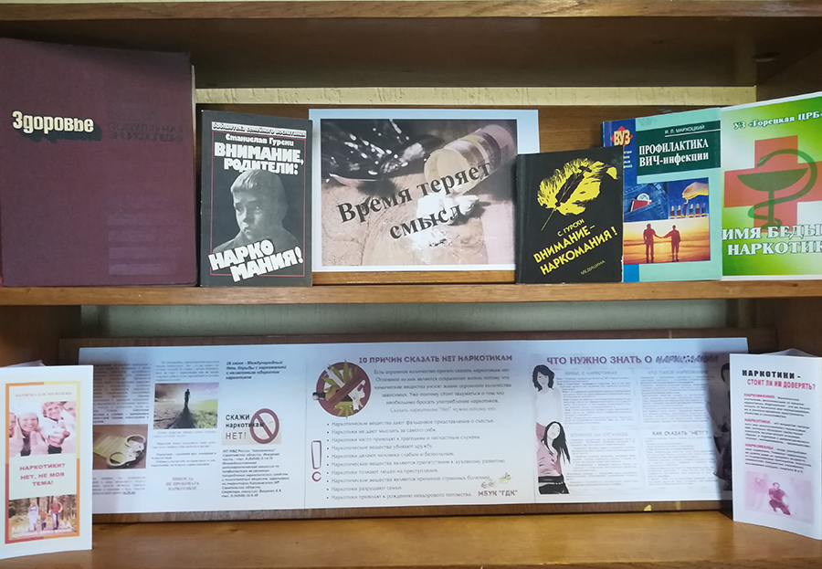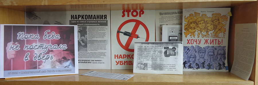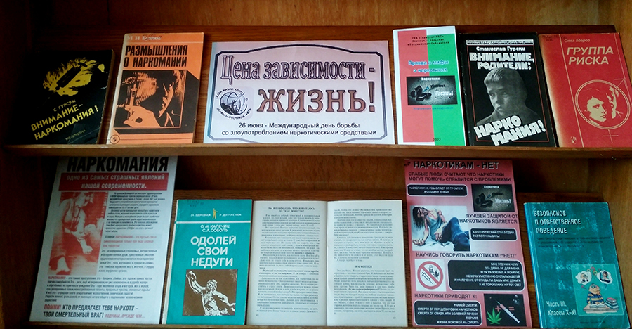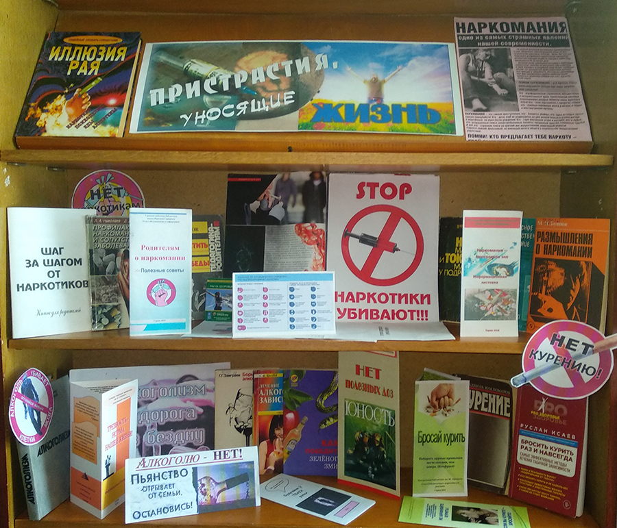 На выставках представлены книги, иллюстрированный материал о наркомании, о вреде наркотиков и борьбе с наркоманией, издания по профилактике вредных привычек, произведения художественной литературы, которые дают наглядный урок трагического исхода приема наркотиков независимо от того, какая причина лежит в основе наркомании.