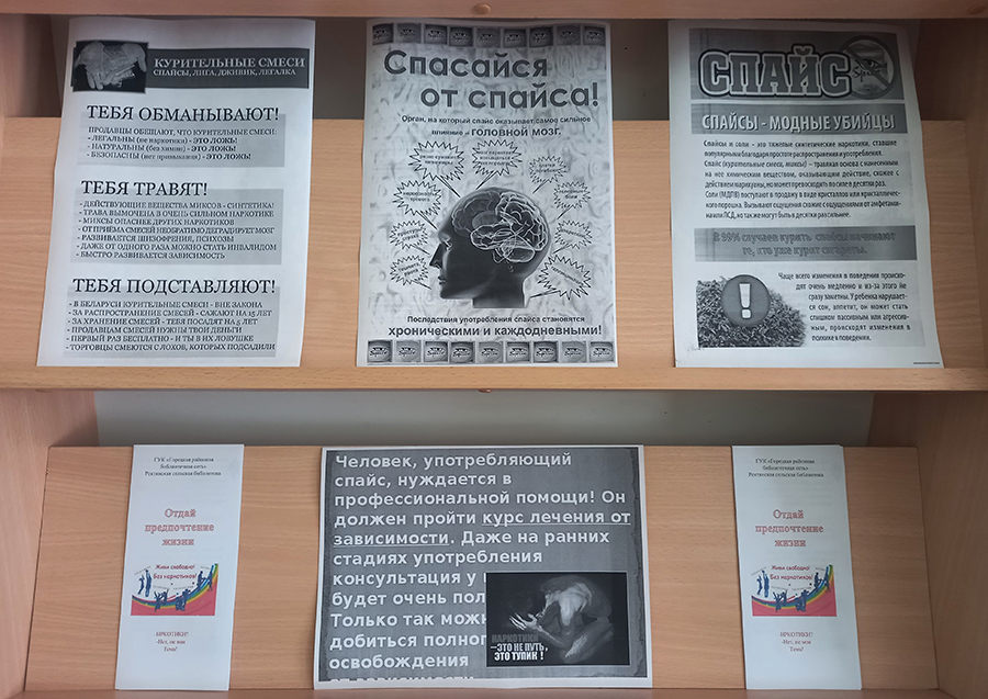 К этому дню библиотеки сети посвятили выставки и тематические полки, раскрывающие всю правду об опасности наркотиков. Так, в Центральной библиотеки им. М. Горецкого действует выставка «Наркомания. Реальная опасность», Горская сельская объединенная библиотека оформила выставку-напоминание «Время теряет смысл», Красулинская сельская библиотека оформила выставку-совет «Пока беда не постучала в дверь», Ленинская сельская объединенная библиотека оформила тематическую полку «Цена зависимости - жизнь», Овсянковская сельская объединенная библиотека оформила выставка-предупреждение «Цена зависимости – жизнь!», Ректянская сельская библиотека оформила выставку-предупреждение «Спасайся от спайса».