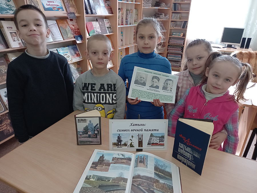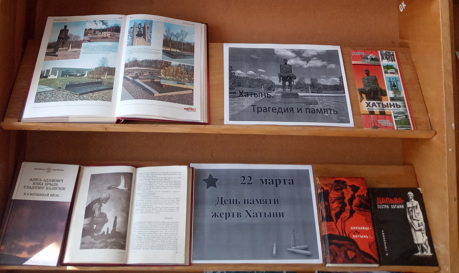 «Хатынь. Трагедия и память» (Каменская сельская объединенная библиотека), «Хатынь: боль и гнев» (Красулинская сельская библиотека), «Боль Хатыни» (Ленинская сельская объединенная библиотека), «Урок истории: Хатынь» (Маслаковская сельская объединенная библиотека), «Хатынь: боль і гнеў» (Паршинская сельская объединенная библиотека), «Хатынь: символ вечной памяти…» (Ректянская сельская библиотека), «Хатынь: трагедия, боль, память» (Рудковщинская библиотека-клуб).