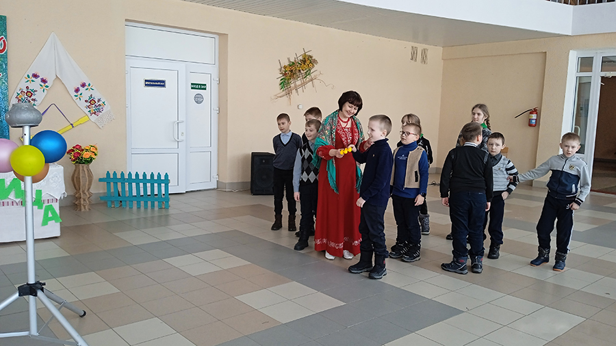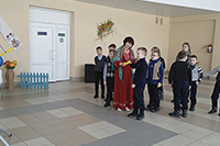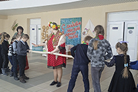 Ребят под веселую музыку встречала хозяйка праздника. Она познакомила их с названиями каждого дня масленичной недели, рассказала об истории празднования Масленицы, ее традициях, играх и забавах, о том, почему масленичный блин является не просто праздничным угощением, а символом золотого солнца.