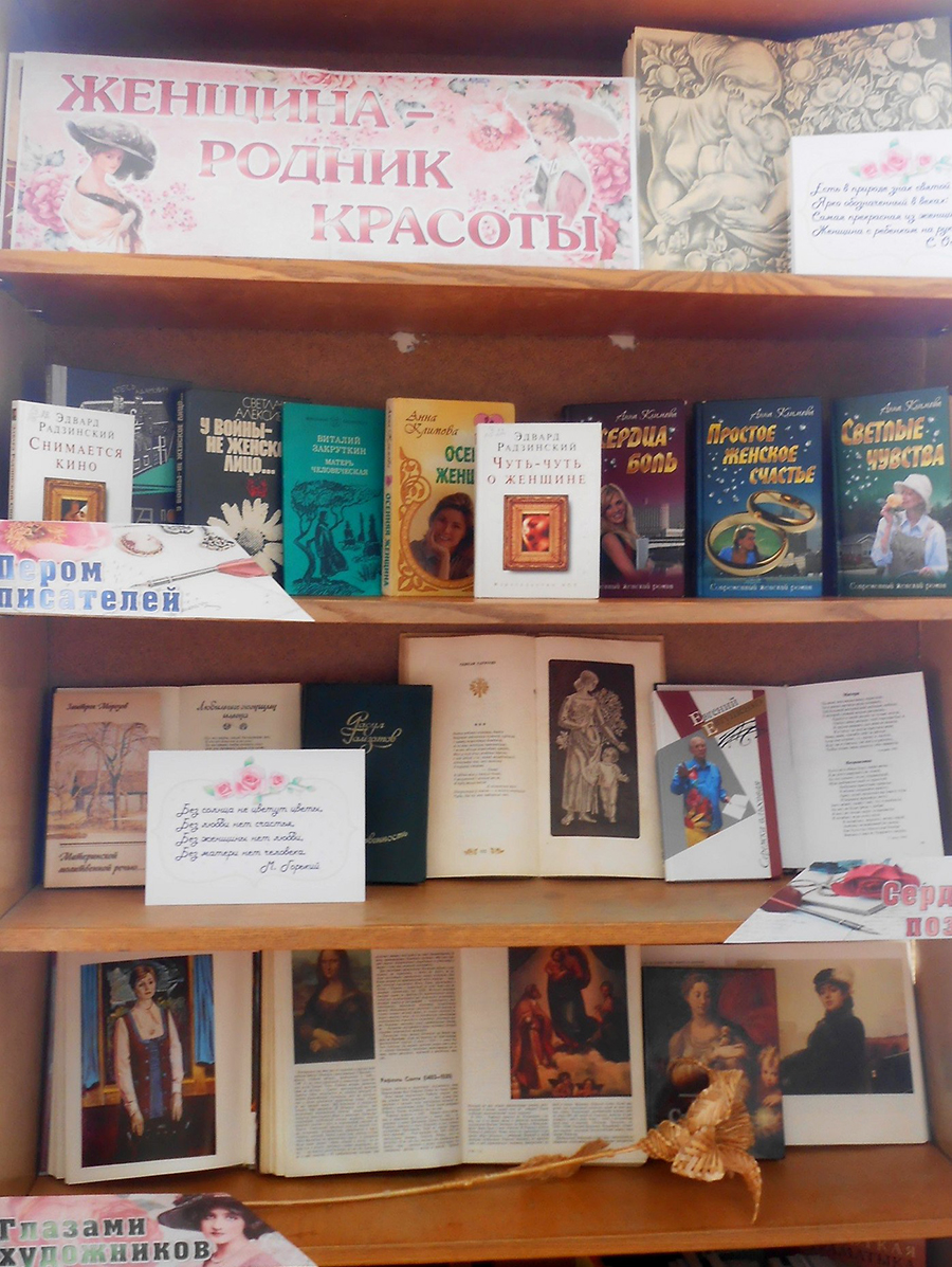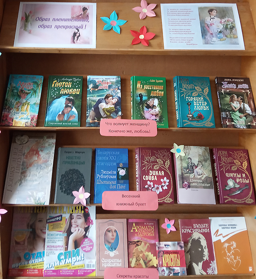 В свою очередь библиотеки ГУК «Горецкая районная библиотечная сеть» дарят необычный букет прекрасных книг, предлагая читателям библиотечную выставку-поздравление «Праздник самых милых дам: бабушек, сестрёнок, мам» в районной детской библиотеке, выставку-просмотр «О, Женщина! Краса земная…» в центральной библиотеке им. М. Горцекого, библиотечные выставки «Жанчына – крыніца ўсёй прыгажосці», «Образ пленительный, образ прекрасный» в Горской и Каменской сельских объединенных библиотеках, книжную выставку «Прекрасных женщин имена» в Рудковщинской библиотеке-клубе. На выставках можно познакомиться с историей возникновения праздника, почитать весёлые стихи и рассказы о маме, бабушке, сестрёнке и подружке знакомых и любимых авторов, а также найти интересные идеи для поделок и подарков.