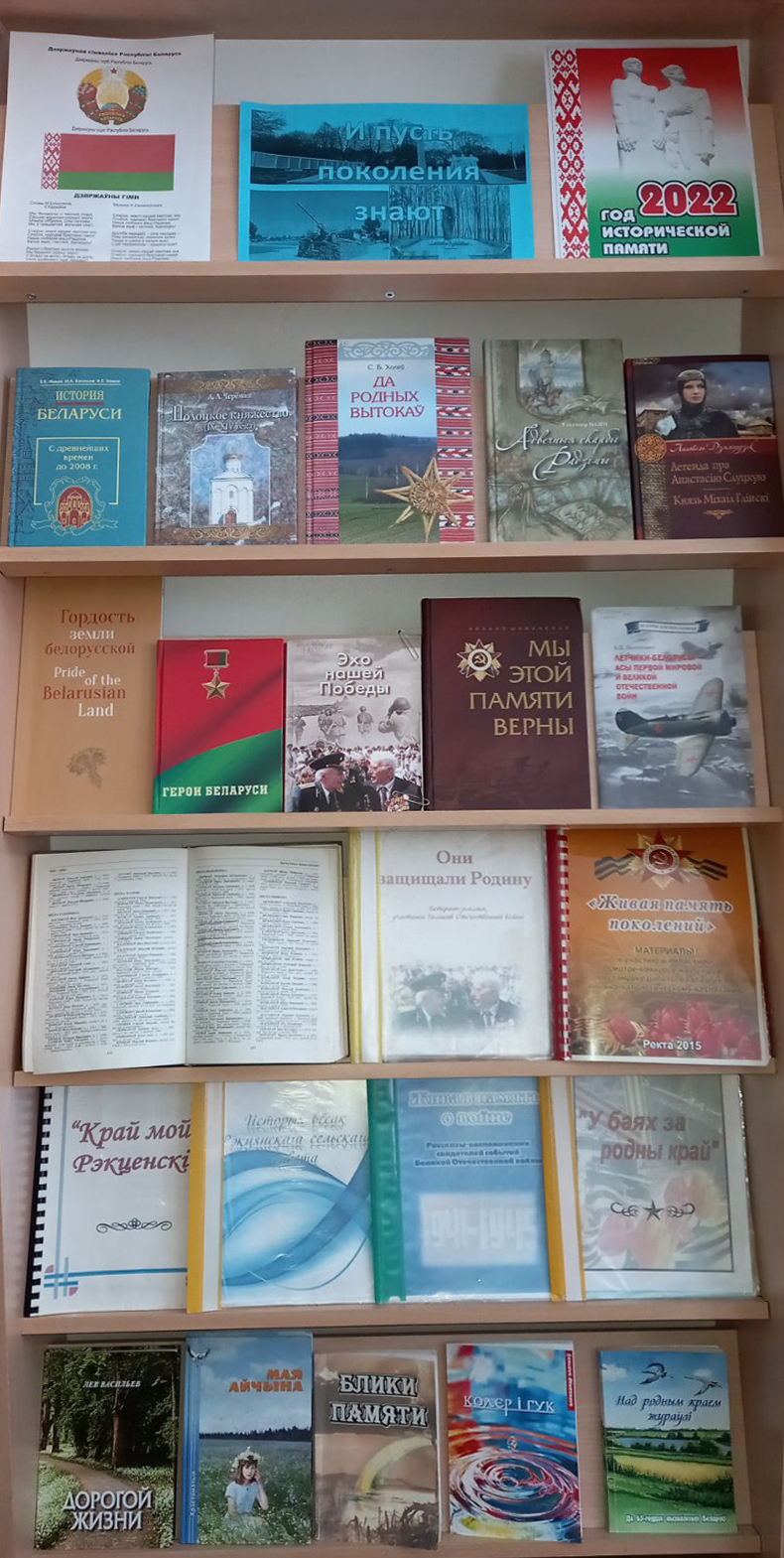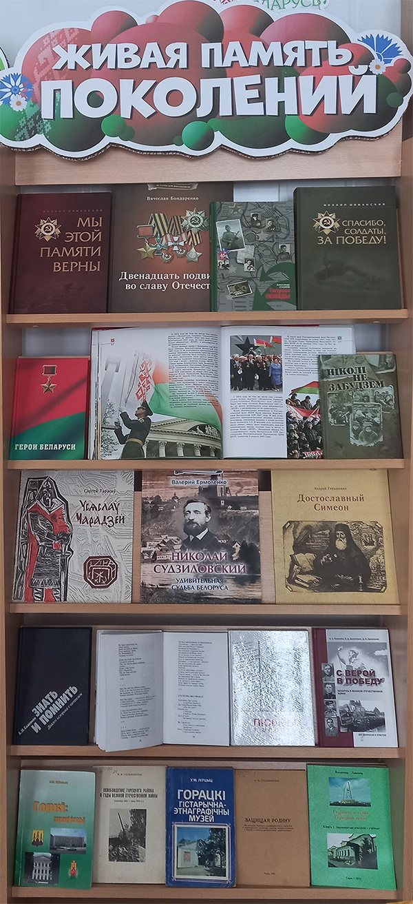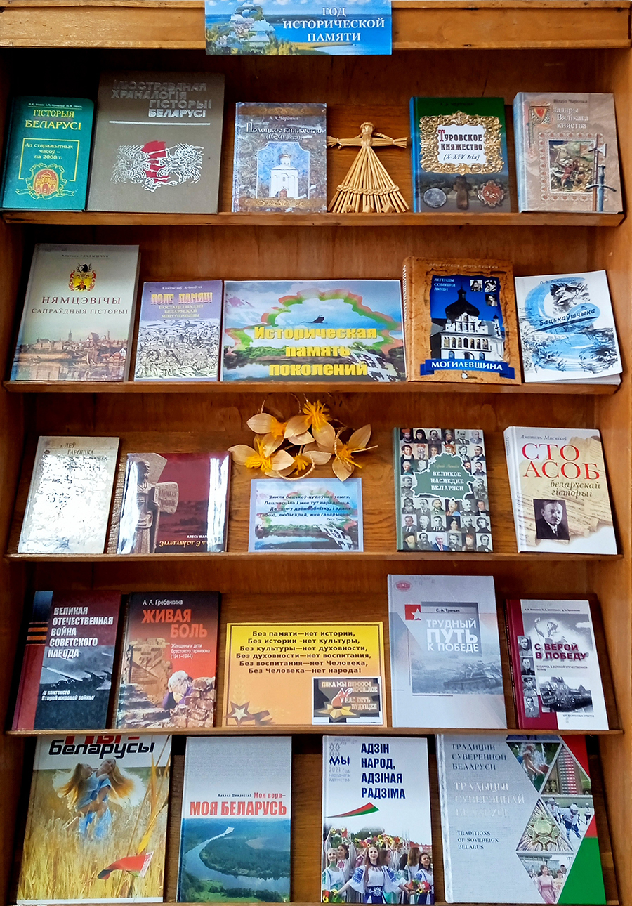 тематическая полка «2022 год – Год исторической памяти» оформлена в Маслаковской сельской объединенной библиотеке. «Историческая память народа» под таким названием экспонируется выставка в Паршинской сельской объединенной библиотеке. Ректянская сельская библиотека представила выставку «И пусть поколения знают». Рудковщинская сельская библиотека-клуб оформила книжную выставку «Живая память поколений»,