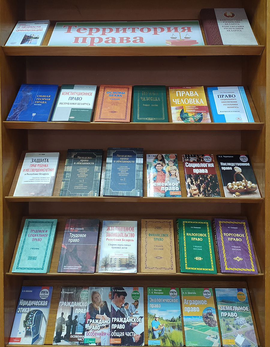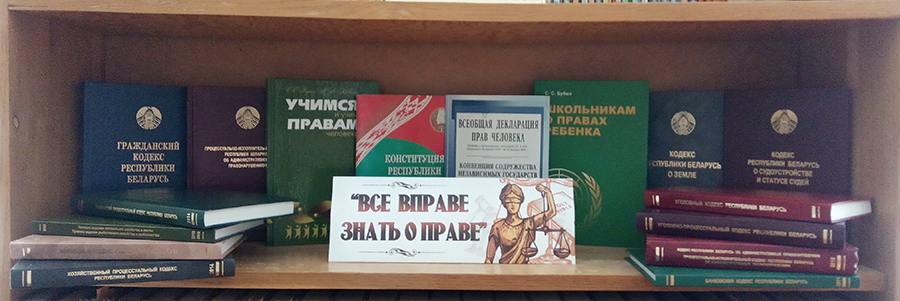 В Центральной библиотеке им. Максима Горецкого была оформлена библиотечная выставка «Территория права». На выставке размещена литература и материалы, которые помогут читателям в изучении своих прав и обязанностей, познакомят с законодательными актами, основными законами Республики Беларусь.