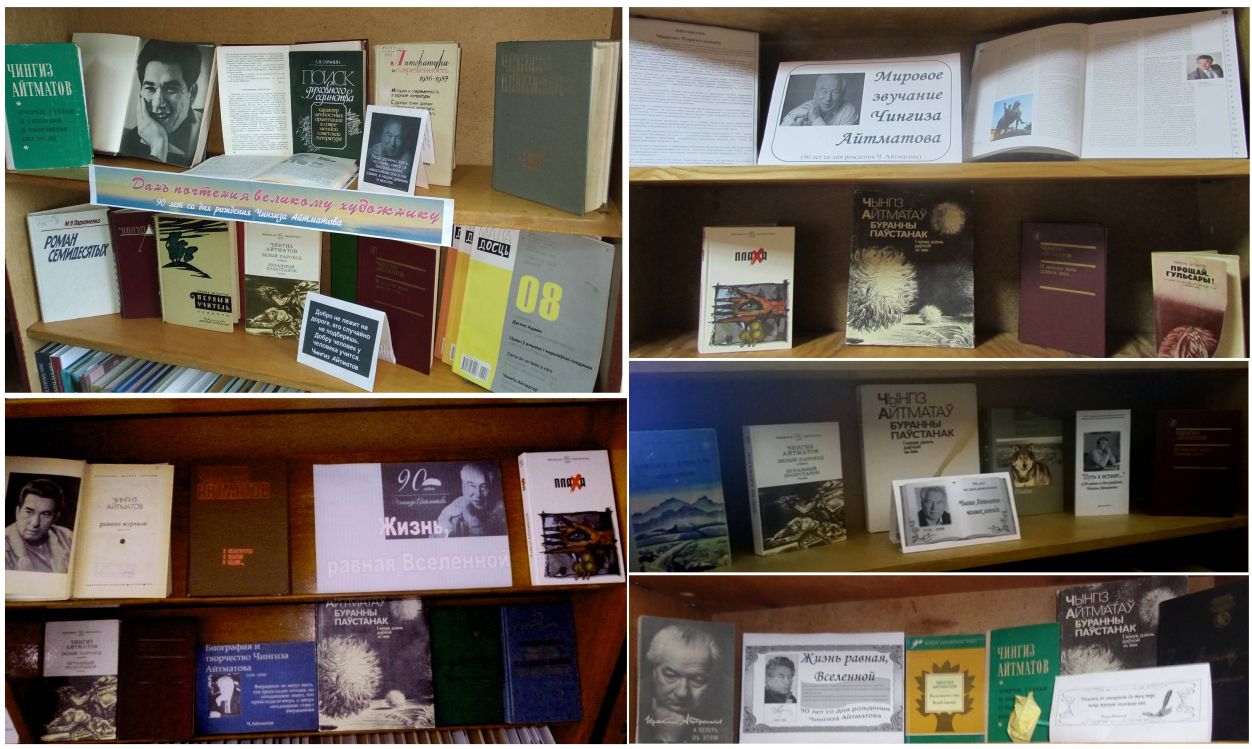 К юбилею великого писателя библиотеки сети оформили выставки и тематические полки: «Жизнь, равная Вселенной» (Красулинская сельская библиотека и Ленинская сельская объединенная библиотека), «Чингиз Айтматов – человек-легенда» (Маслаковская сельская объединенная библиотека), «Мировое звучание Чингиза Айтматова» (Овсянковская сельская объединенная библиотека), «Дань почтения великому художнику» (центральная библиотека им. М. Горецкого). Сотрудница Маслаковской сельской объединенной библиотеки подготовила для читателей информационный буклет «Путь к истине…», где отображены основные вехи биографии писателя, а также дается краткая аннотация его наиболее известных произведений. В Савской сельской объединенной библиотеке был проведен обзор «Вселенная Чингиза Айтматова», во время которого присутствующие познакомились с биографией и творчеством классика.