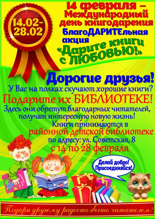 Уважаемые жители Горок! Приглашаем вас принять участие в акции «Дарите книги с любовью». Акция стартует 14 февраля 2018 года в Международный день книгодарения. Организатор – районная детская библиотека. Данная акция направлена на возрождение в обществе традиции книгодарения. Если у вас есть книги, которые вы уже прочитали и вам не жалко с ними расстаться, смело несите их в детскую библиотеку. Это может быть любая книга, единственное условие: она должна быть в хорошем состоянии и представлять интерес для детей и молодежи. При желании вы можете оставить на своем подарке дарственную надпись.