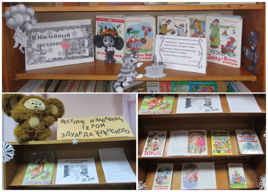 В честь юбилея автора Овсянковская сельская объединенная библиотека оформила выставку «Веселые и забавные герои Эдуарда Успенского», а Красулинская – тематическую полку «Юбилейный звездопад». Рудковщинская сельская библиотека в свою очередь провела с детьми занимательную литературную игру «Волшебные страницы» по произведениям автора.