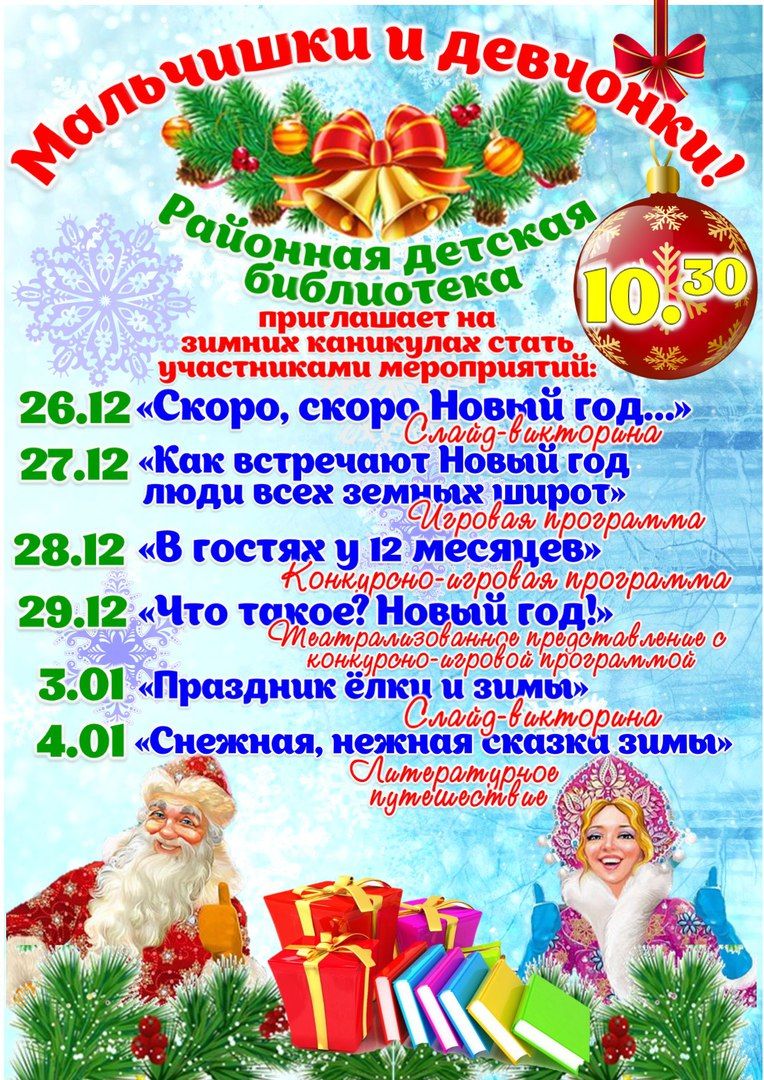 Вот и закончились зимние каникулы. Отдохнувшие и счастливые ребята вернулись за школьные парты, а библиотеки могут подвести итоги своей работы, ведь, как обычно, во время каникул перед ними стояла важная задача – организовать досуг ребят. Вот и на зимних каникулах двери всех библиотек сети были распахнуты для юных читателей. Здесь их ждали различные викторины, конкурсы, игровые программы.