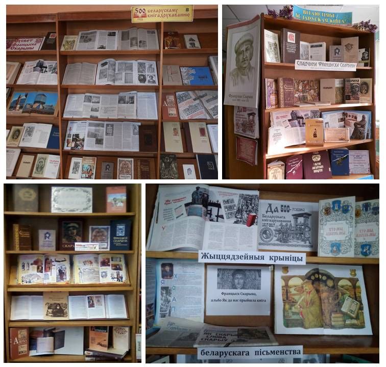 На выставах, прымеркаваных да юбілея, былі прадстаўлены шматлікія цікавыя выданні пра нашага славутага першадрукара. Так, у чытальнай зале цэнтральнай бібліятэкі была арганізавана вялікая выстава пад назвай «Сусвет Францыска Скарыны», а на абанеменце гэтай жа бібліятэкі – выстава «Спадчына Францыска Скарыны». Гарская сельская бібліятэка падрыхтавала выставу «Жыццядзейныя крыніцы беларускага пісьменства», а Маслакоўская бібліятэка - выставу-прысвячэнне «Сейбіты вечнага».