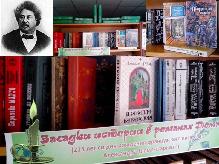 24 июля исполняется 215 лет со дня рождения популярного писателя, драматурга и журналиста Александра Дюма – старшего - автора известных всем приключенческих романов, одного из самых известных и публикуемых французских литераторов на планете, книги которого переведены более чем на 100 языков и до сих пор переиздаются огромными тиражами. В центральной библиотеке им. М. Горецкого этой праздничной дате посвятили выставку «Загадки истории в романах Дюма», которая собрала для читателей лучшие произведения великого француза.
