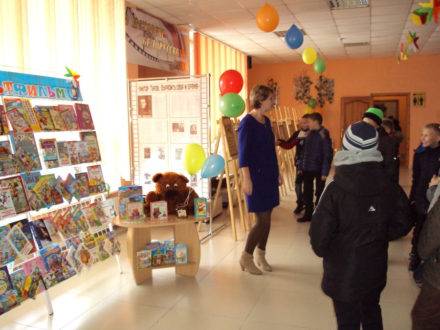 В фойе звучала музыка из любимых мультфильмов, на экране телевизора демонстрировались ролики с песнями разных лет. Гостей встречали сказочные герои Волк и Лиса. До начала показа все желающие могли скоротать время за просмотром выставок. ГУО «Детская школа искусств и художественных ремесел г. Горки» организовала выставку детского изобразительного искусства «Мой любимый мультфильм», а районная детская библиотека оформила развёрнутую библиотечную выставку-просмотр «В гостях у студии «Союзмультфильм» .
