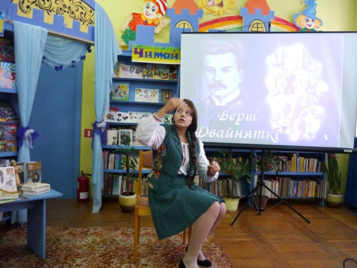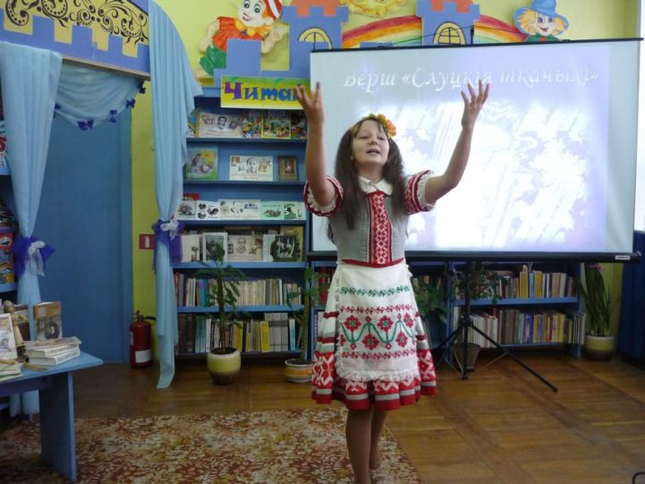 Знаёмства з жыццёвым і творчым шляхам пісьменніка перамяжоўвалася гучаннем яго твораў у выкананні Калтуненка Марыі, Ягоркінай Дзіяны, Тарасенка Алены, Кішкун Настассі. Удзельніцы тэатральнай студыі ўнеслі вялікі эмацыянальны зарад у гэта мерапрыемства. Вершы, якія дэкламаваліся («Вершы, мае вершы…», «Скірпуся», «Слуцкія ткачыхі», «Бяседная» і іншыя), гучалі пранікнёна і з натхненнем, арганічна спалучаліся з агульным матывам вечарыны і выклікалі ў гледачоў дружныя воплескі.